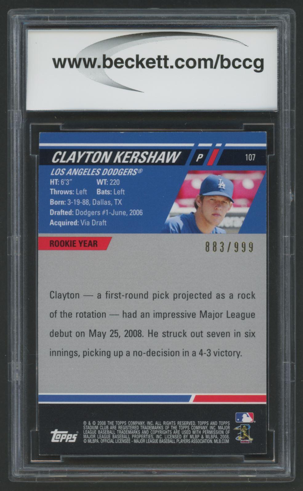 Clayton Kershaw 2008 Stadium Club VAR #107B #883/999 (BCCG 10)
