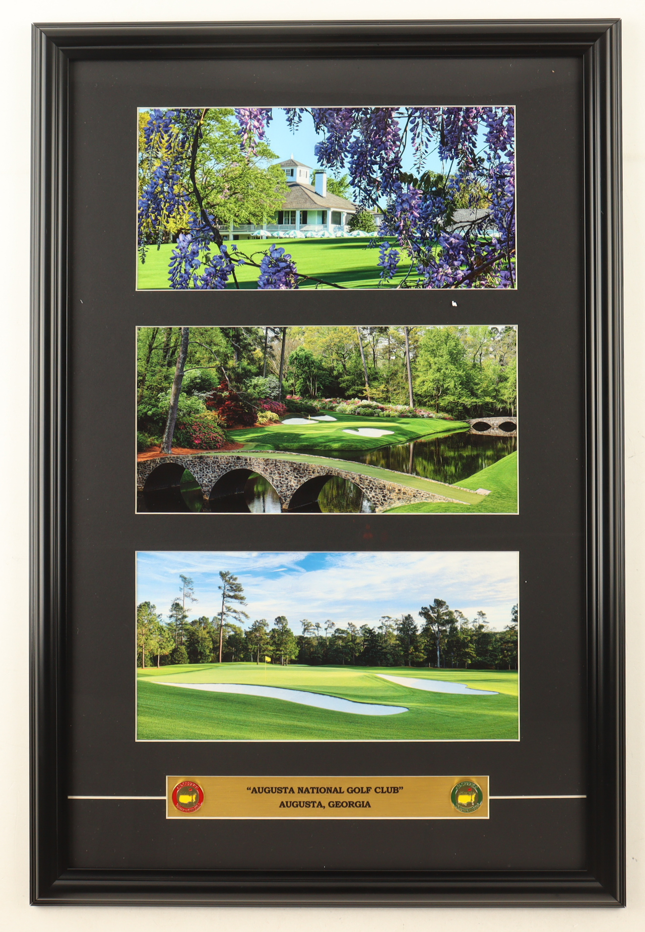 Custom frame measures approximately 18" x 27" in size and features (3) 6" x 12" photos of the Augusta National Golf Course. The display also includes (2) official Masters Tournament pins as well as a matching title plaque. Please note, the display is unsigned.