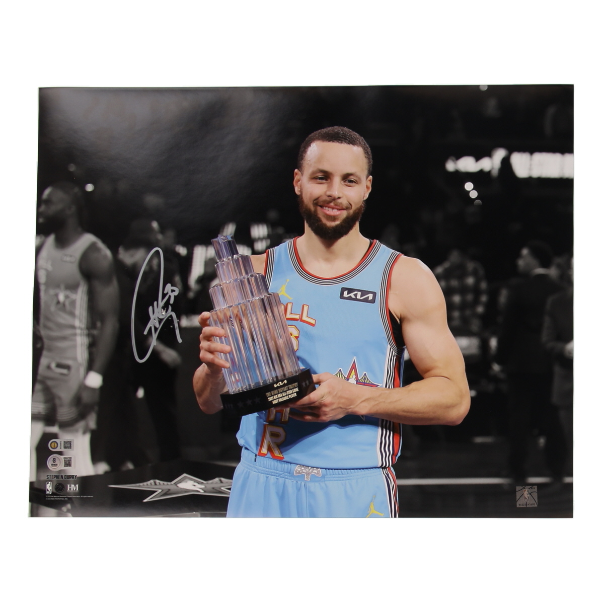 Photo measures 16" x 20" in size and has been hand-signed by Stephen Curry (Golden State Warriors). Please note, the signature has been smudged.