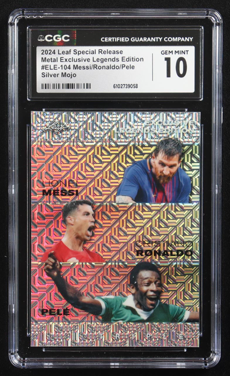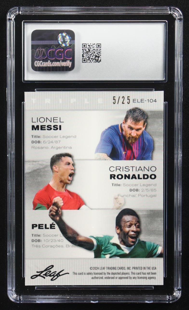 Lionel Messi / Cristiano Ronaldo / Pele 2024 Leaf Metal Special Release Exclusive Legends Ed. Silver Mojo Triple #ELE-104 #5/25 (CGC 10)