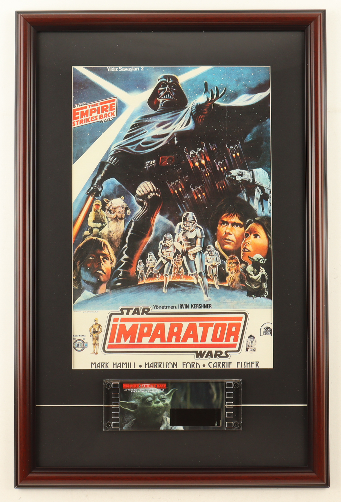 Custom frame measures 17" x 26" in size and features an Italian print of "Star Wars: The Empire Strikes Back," as well as an Original 1979 70mm Film Cell with Star Wars Hologram.