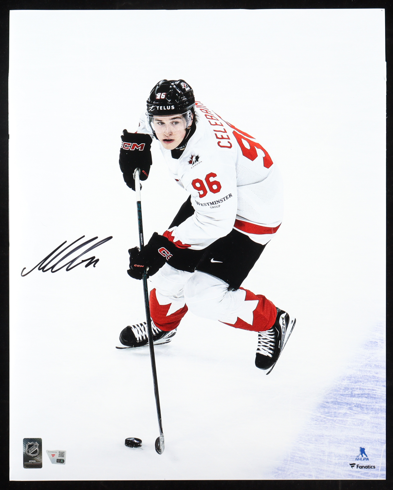 Photo measures 16" x 20" in size. Hand-signed by Macklin Celebrini (Team Canada).