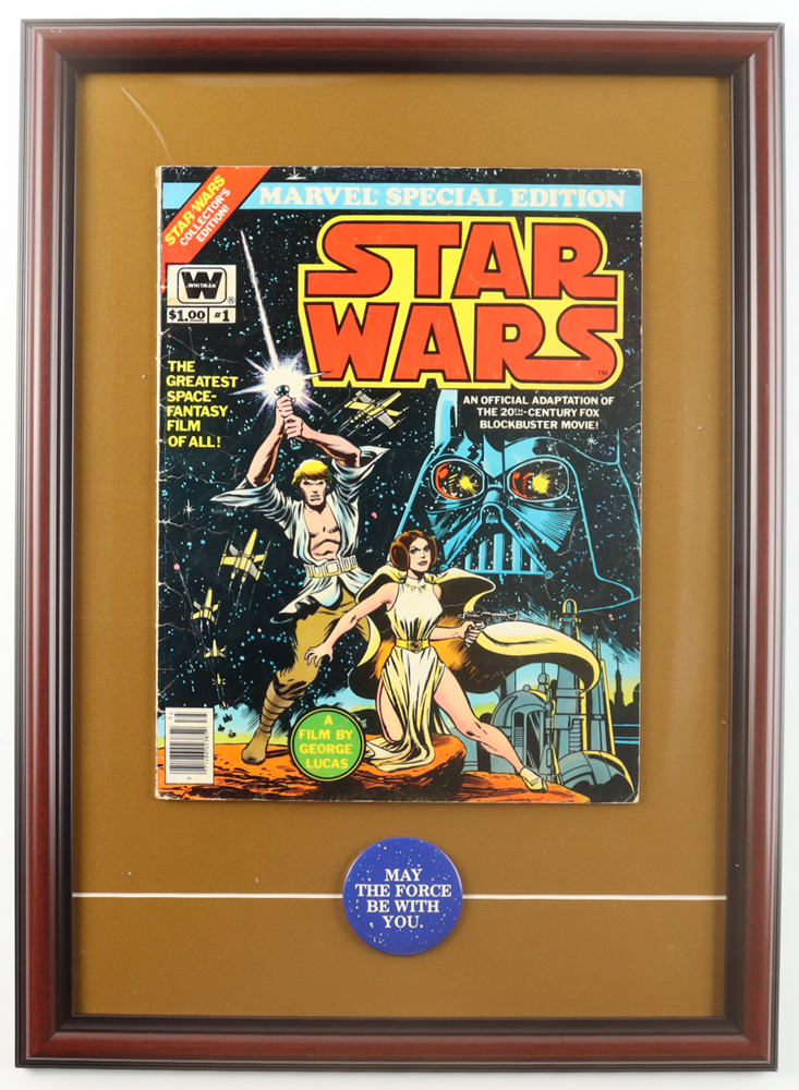 Custom frame measures approximately 16" x 22" in size and features the 1977 "Star Wars" Issue #1 Special Edition Marvel Comic Book as well as a 1977 movie release pin. Please note, the display is unsigned.