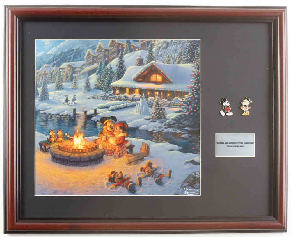 Thomas Kinkade "Mickey & Minnie By The Campfire" Custom Framed Print Display with Set of (2) Mickey & Minnie Pins & Title Plaque