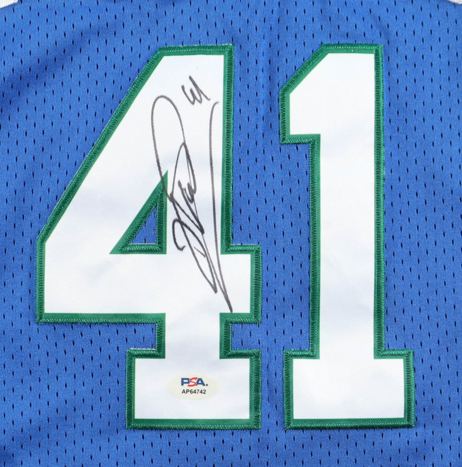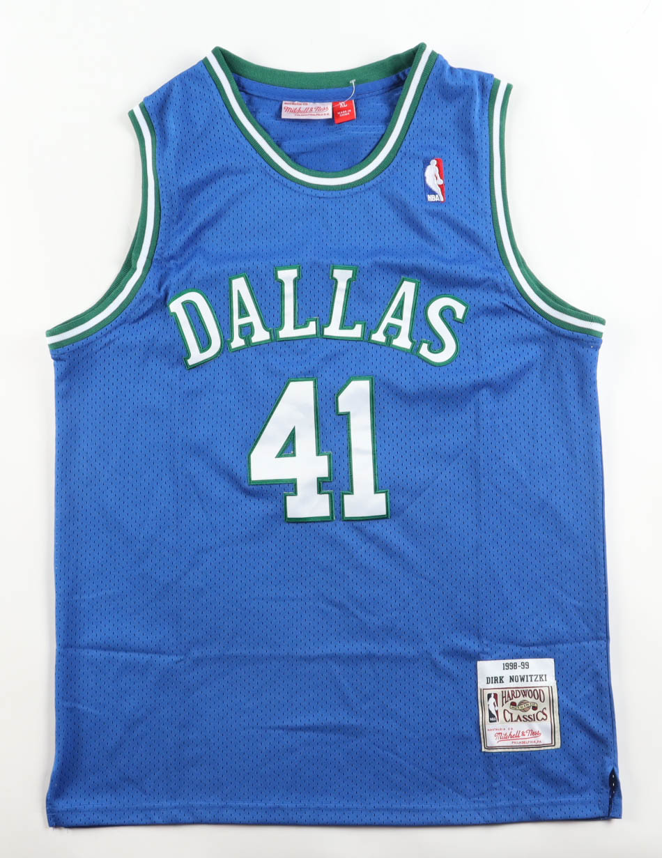 Mitchell & Ness jersey with everything sewn on, size XL. Hand-signed by Dirk Nowitzki (Dallas Mavericks, HOF).