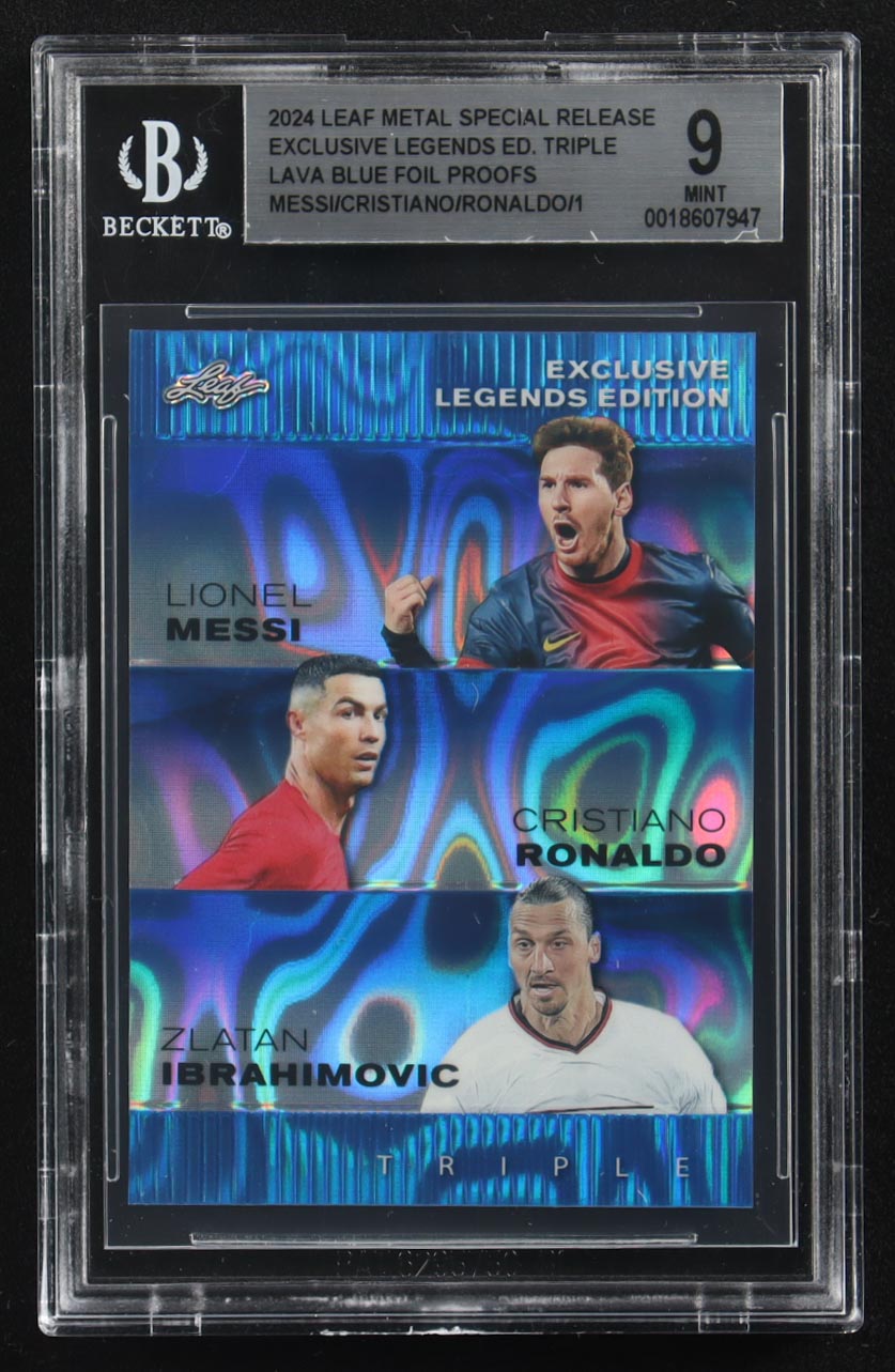 Lionel Messi / Cristiano Ronaldo / Zlatan Ibrahimovic 2024 Leaf Metal Special Release Exclusive Legends Ed. Triple Lava Blue Foil Proofs (BGS 9)