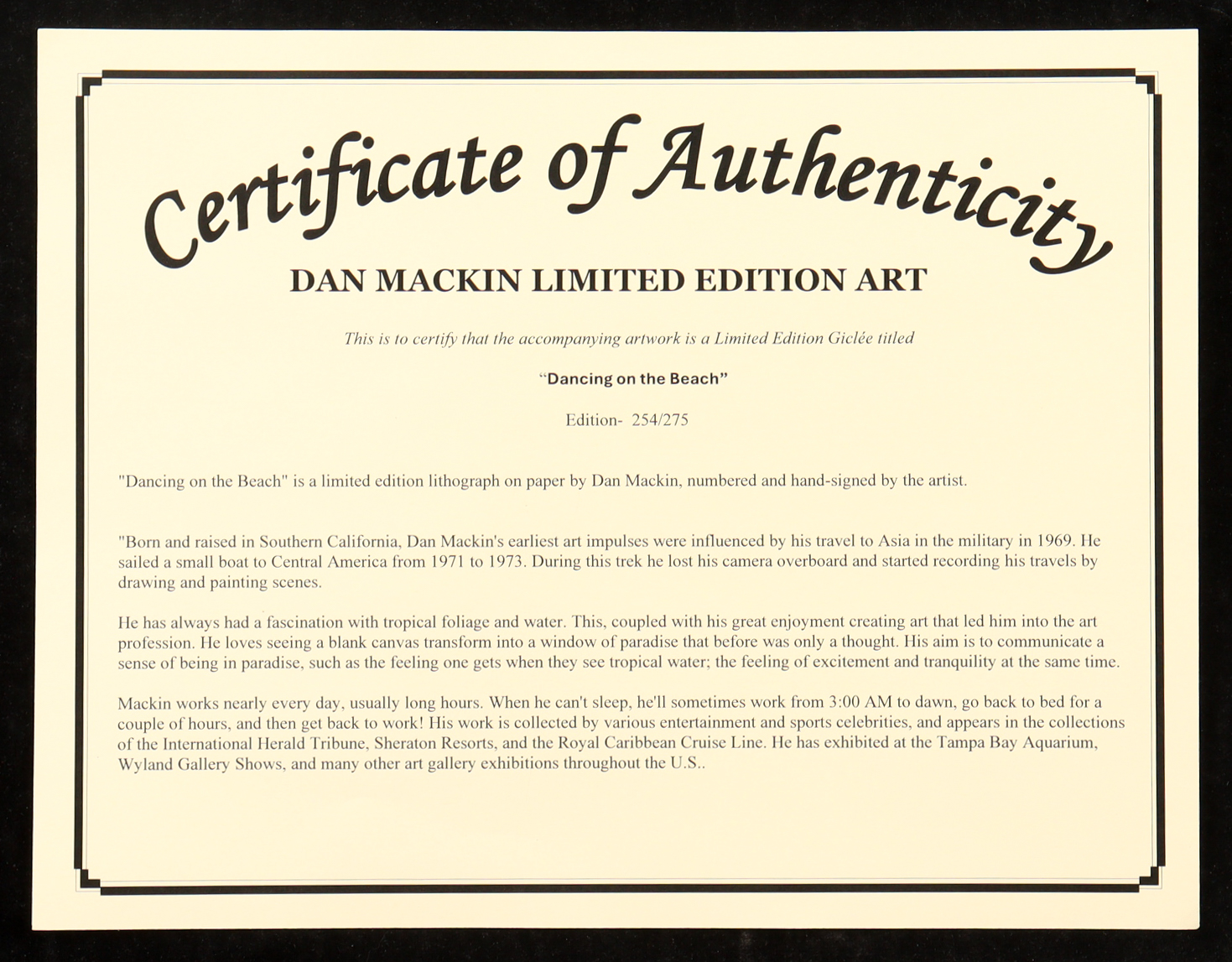 Mackin works nearly every day, usually long hours. When he can't sleep, he'll sometimes work from 3:00 AM to dawn, go back to bed for a couple of hours, and then get back to work! His work is collected by various entertainment and sports celebrities, and appears in the collections of the International Herald Tribune, Sheraton Resorts, and the Royal Caribbean Cruise Line. He has exhibited at the Tampa Bay Aquarium, Wyland Gallery Shows, and many other art gallery exhibitions throughout the U.S..