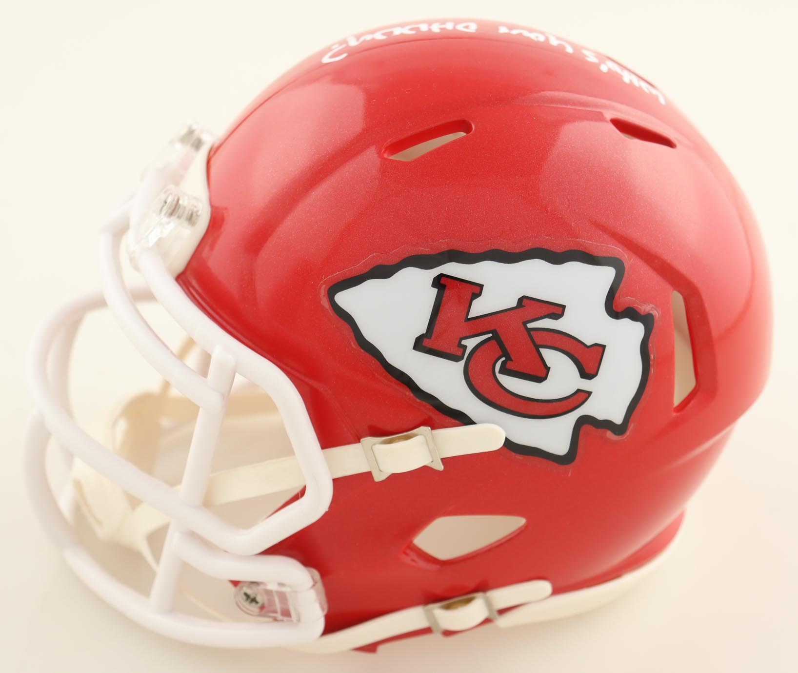Riddell Kansas City Chiefs Speed mini helmet. Hand-signed and inscribed by Pat Mahomes (Minnesota Twins).