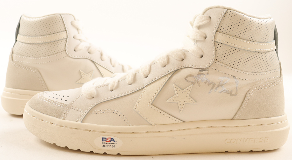 Larry Bird Signed Pair of (2) Converse All Star White Leather Basketball Shoes with Display Case (PSA)