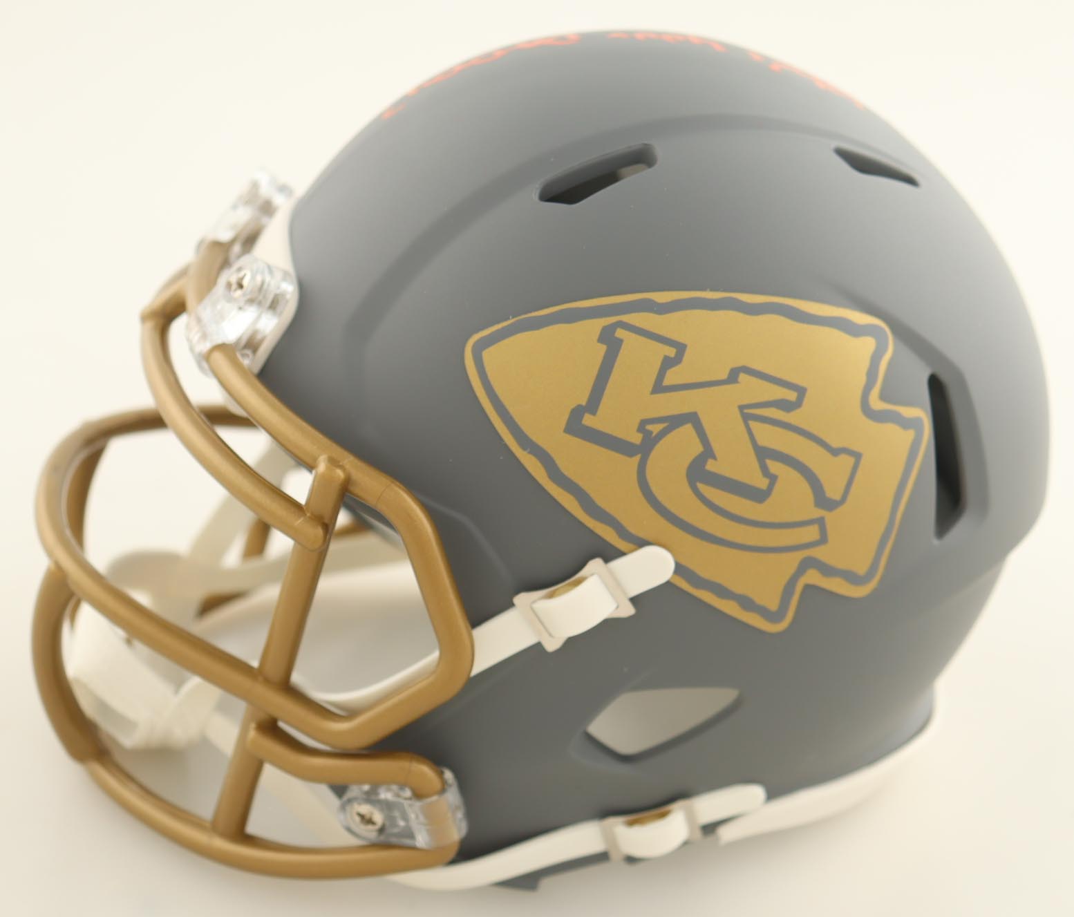 Riddell Kansas City Chiefs Slate Alternate Speed mini helmet. Hand-signed and inscribed by Pat Mahomes (Minnesota Twins).