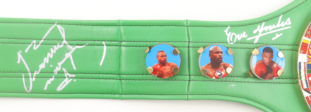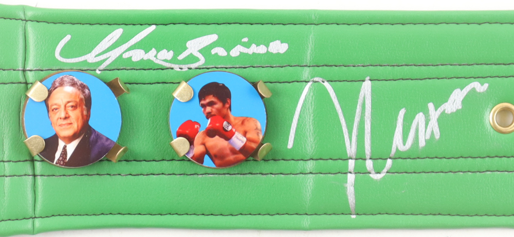 Full-Size WBC replica boxing championship belt measures approximately 48" in length. Hand-signed by (3) with Julio Cesar Chavez, Erik Morales & Marco Antonio Barrera. Please refer to photos regarding the condition of the item.