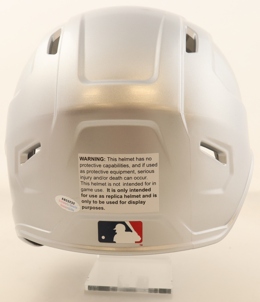 Rawlings Chicago White Sox Full-Size Chrome Replica Batting Helmet. Hand-signed and inscribed by Frank Thomas (HOF). Please note, the helmet comes with the display stand and the original packaging.