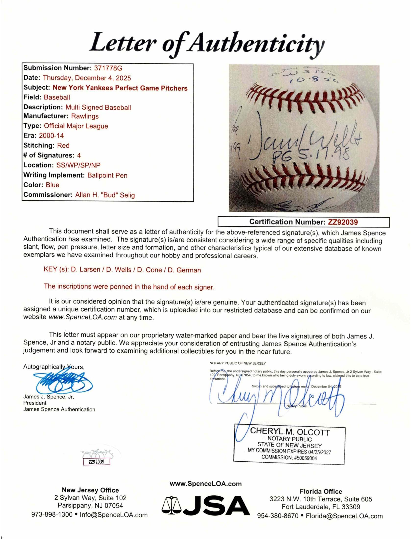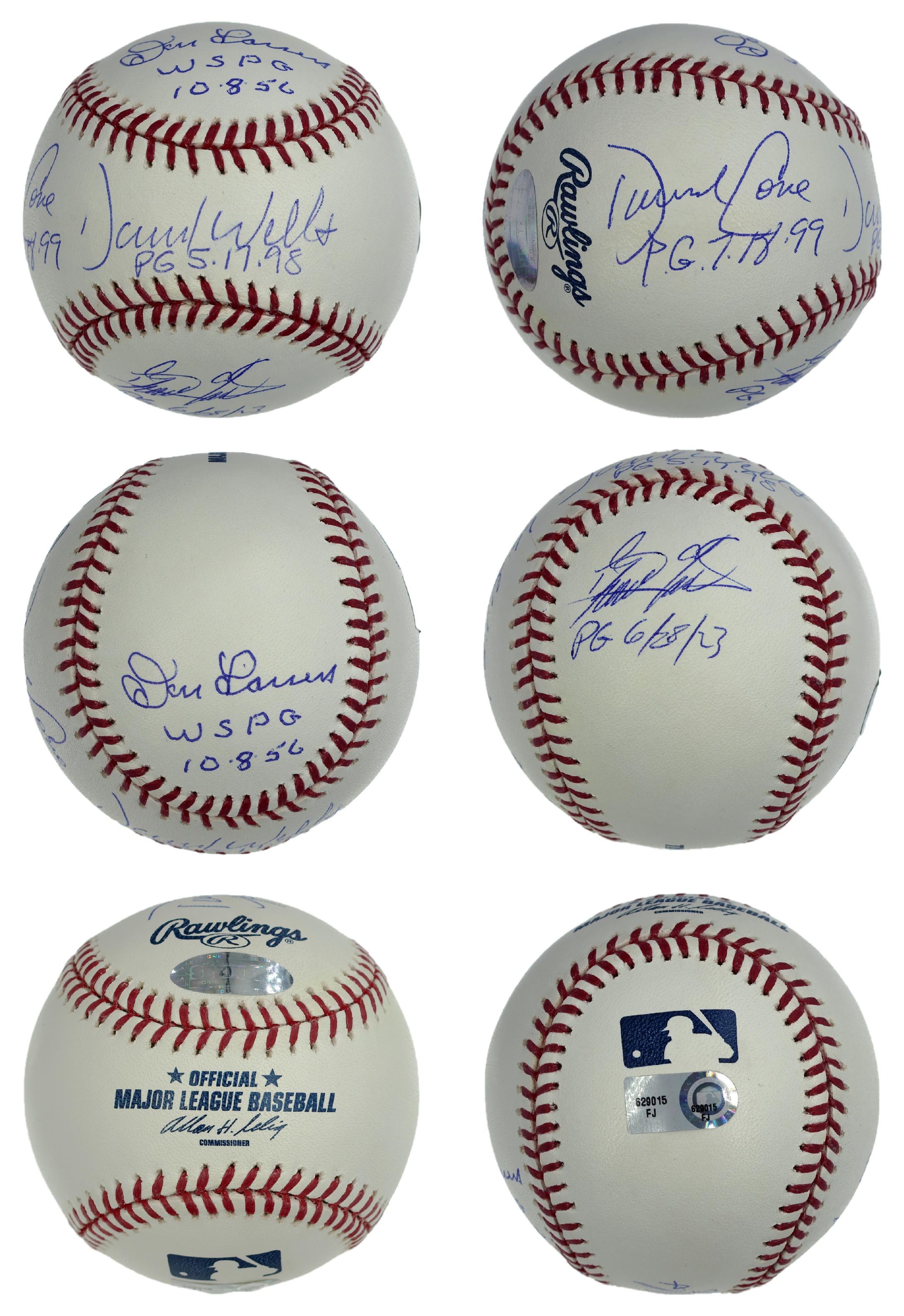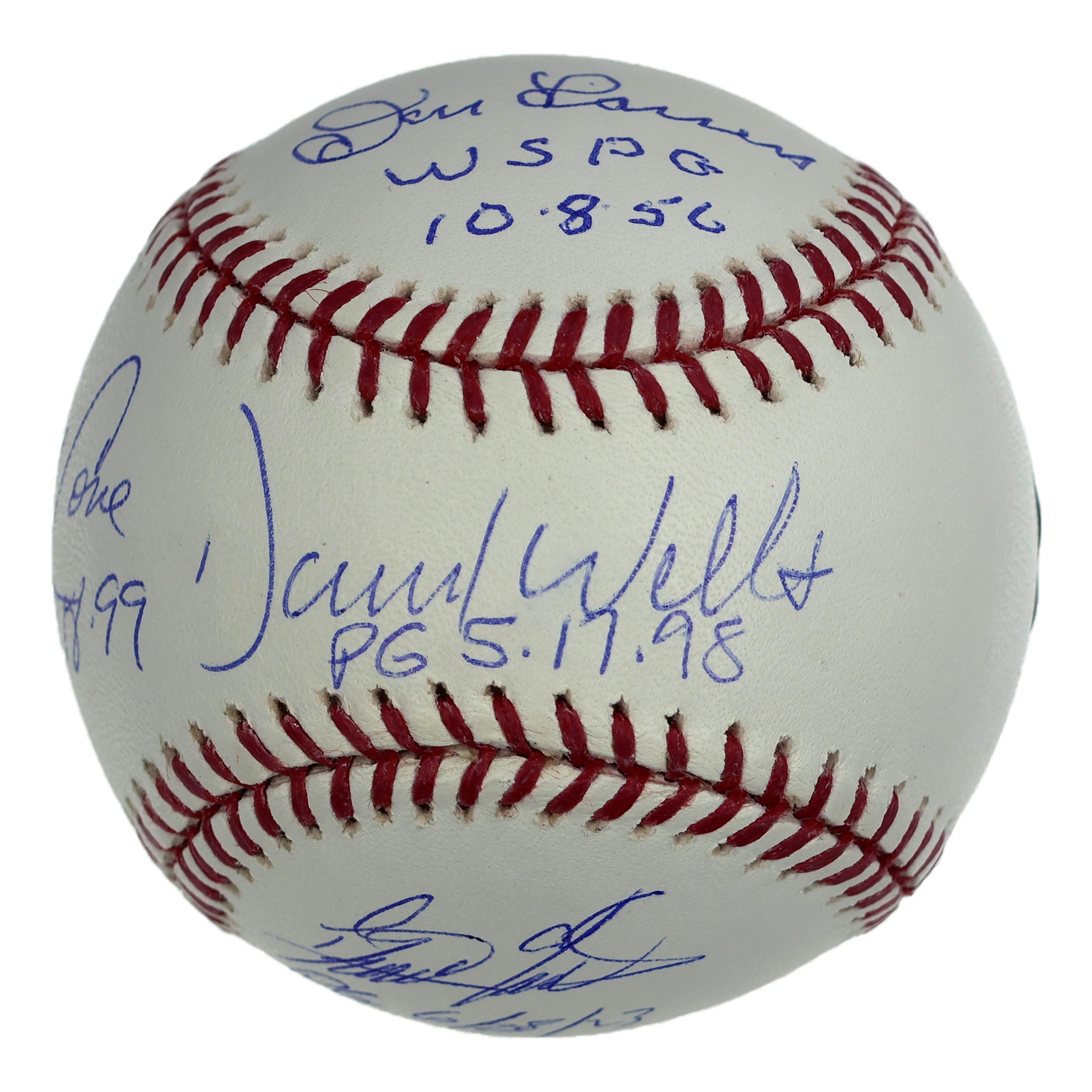 Yankees Perfect Game Pitchers OML Baseball Signed & Inscribed By (4) with Don Larsen, David Wells, David Cone & Domingo German (JSA)