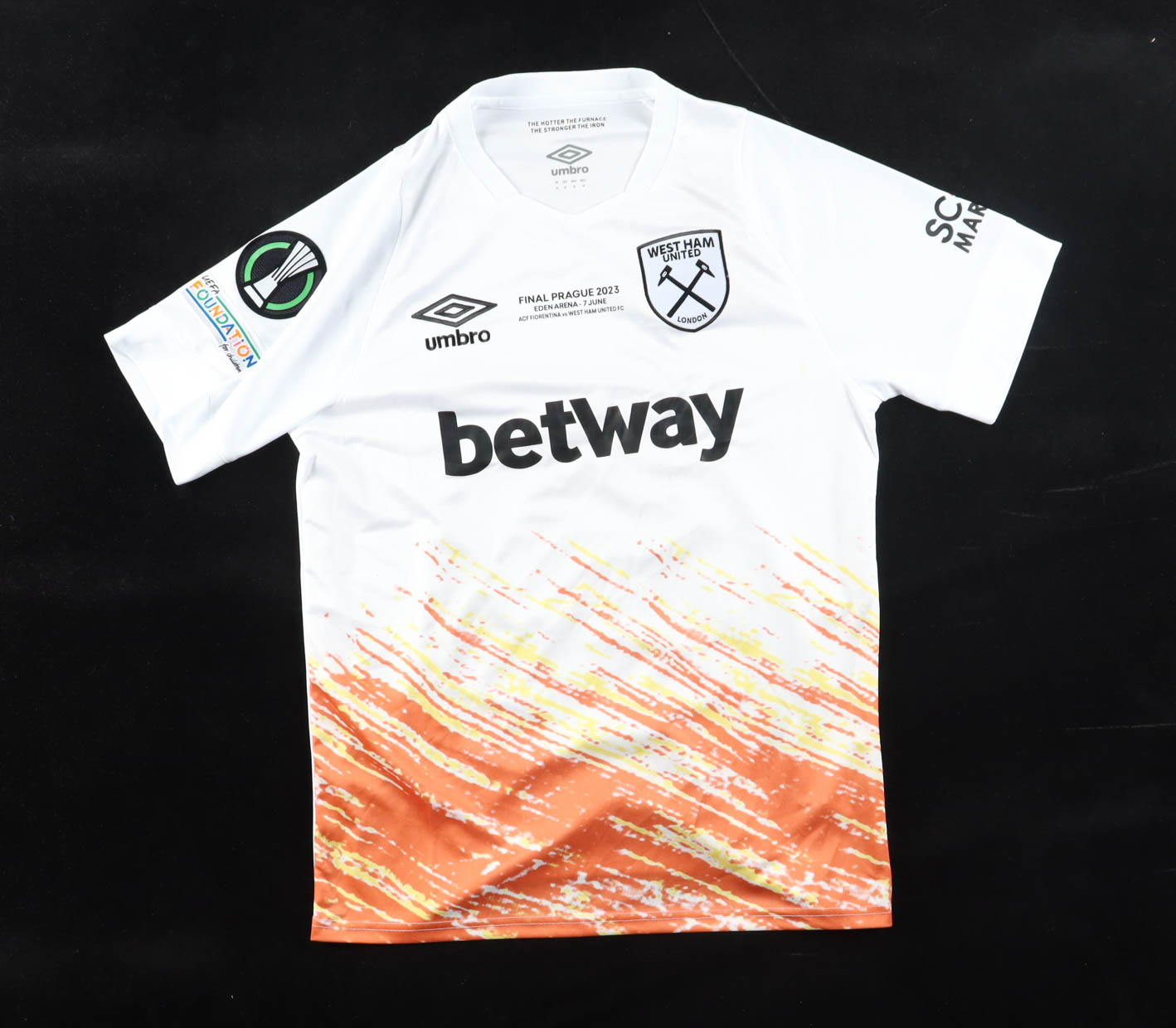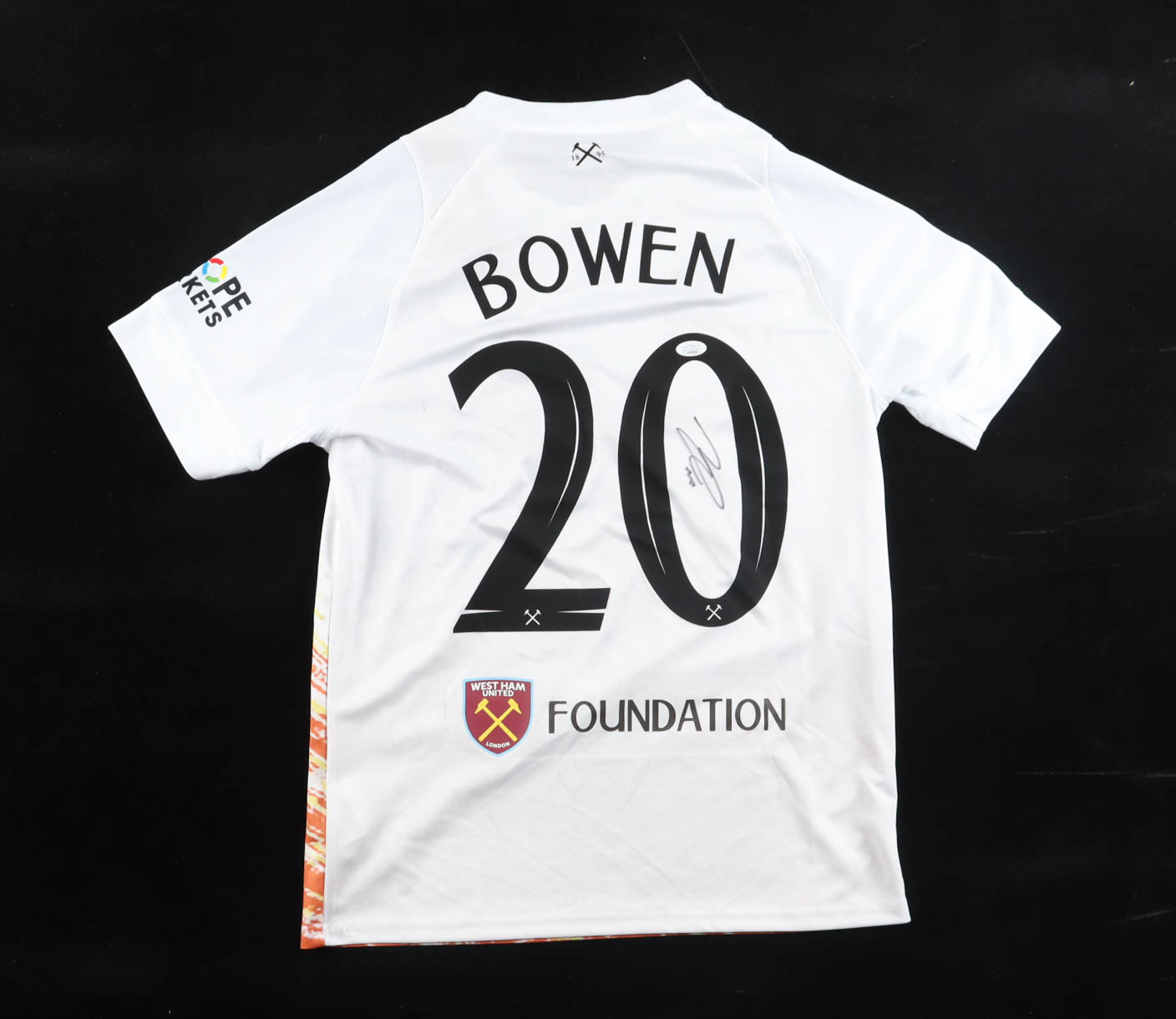 Umbro Authentic jersey with everything pressed on, size M. Hand-signed by Jarrod Bowen (West Ham United F.C.). Please note, there is a stain to the left of the West Ham United F.C logo on the back of the jersey.