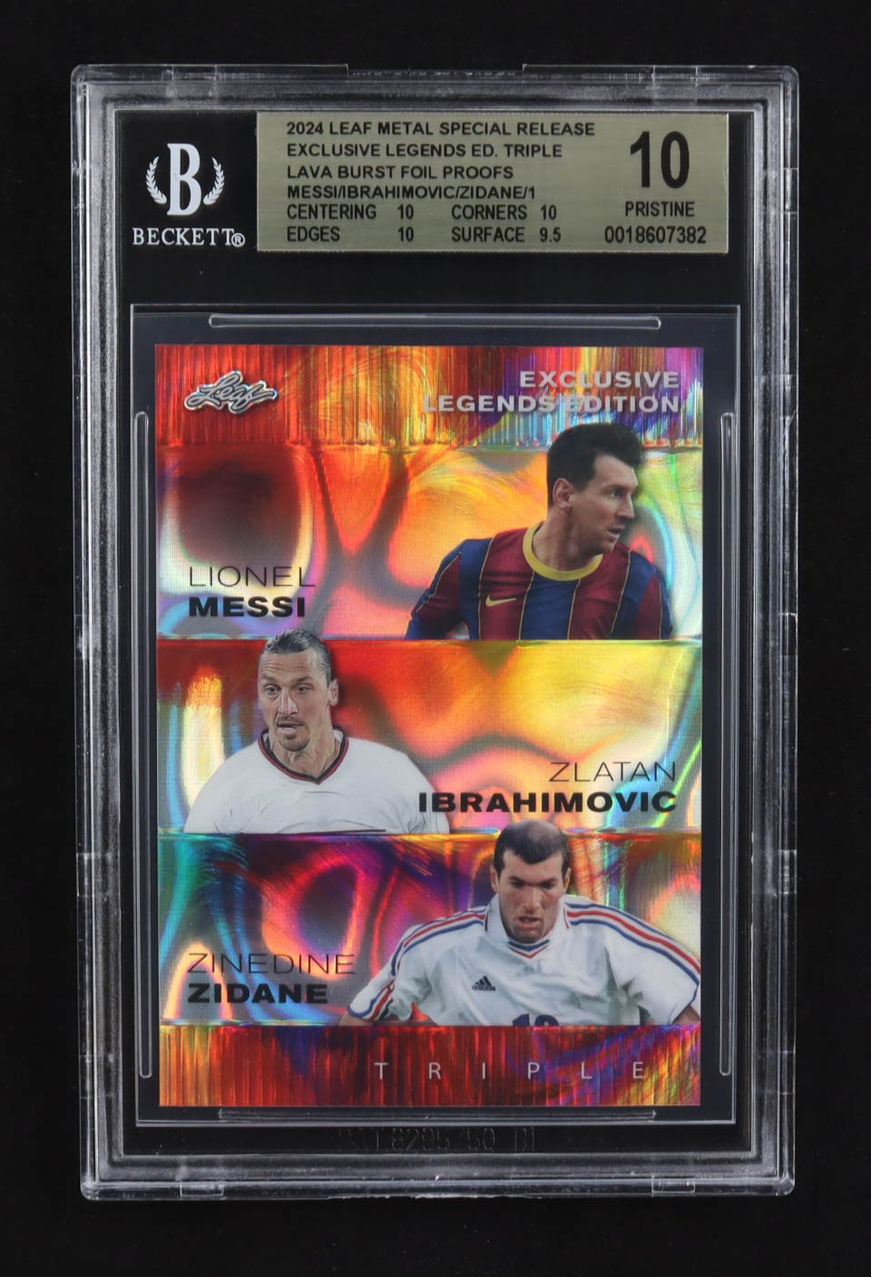 Lionel Messi / Zinedine Zidane / Zlatan Ibrahimovic 2024 Leaf Metal Special Release Exclusive Legends Ed. Triple Lava Burst Foil Proofs (BGS 10)