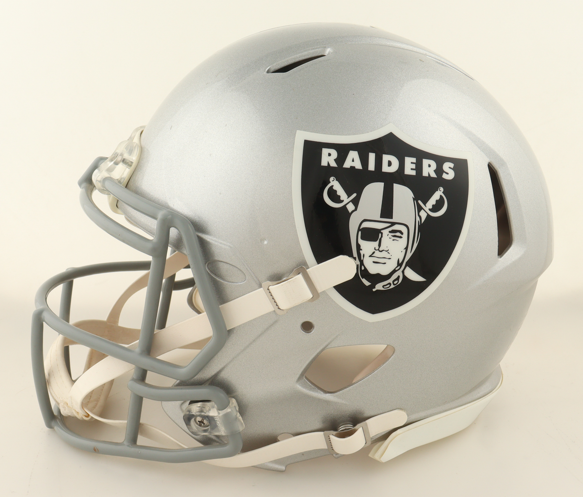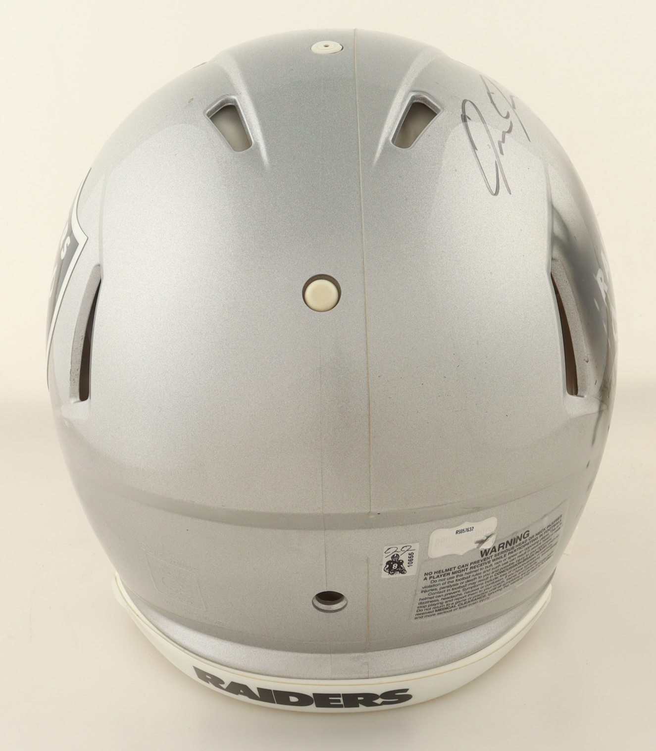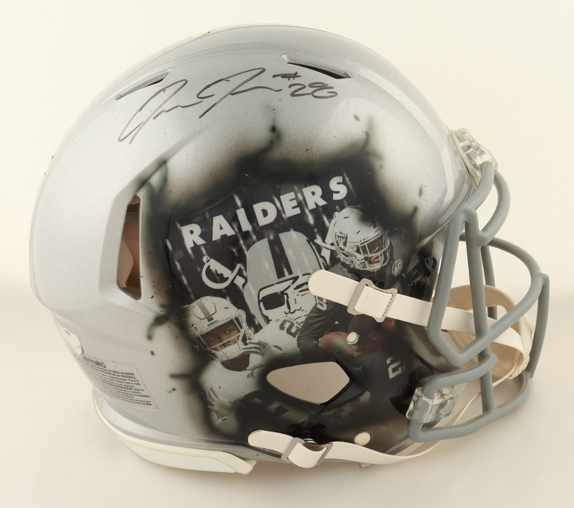 Riddell Oakland / Las Vegas Raiders Full-Size Authentic On-Field Custom Speed Helmet has been hand-signed by Josh Jacobs.