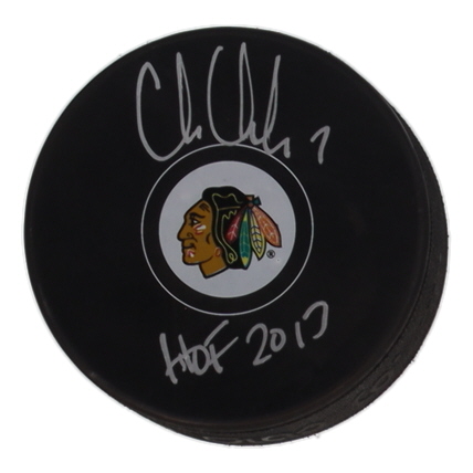Chicago Blackhawks Logo Hockey Puck. Hand-signed and inscribed by Chris Chelios (HOF).