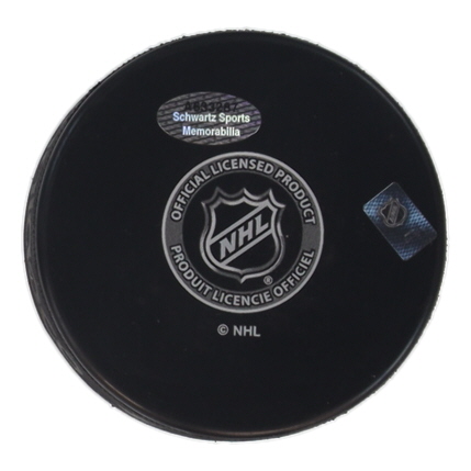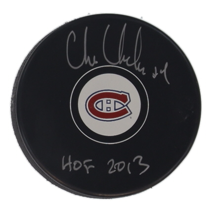 Montreal Canadiens Logo Hockey Puck. Hand-signed and inscribed by Chris Chelios (HOF).