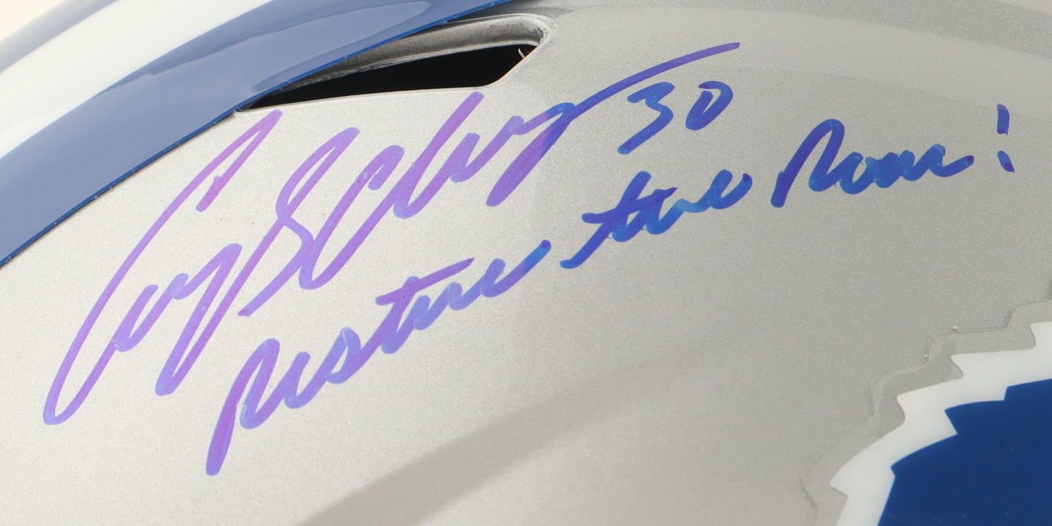Riddell Detroit Lions Full-Size Replica Speed Helmet has been hand-signed and inscribed by Cory Schlesinger.