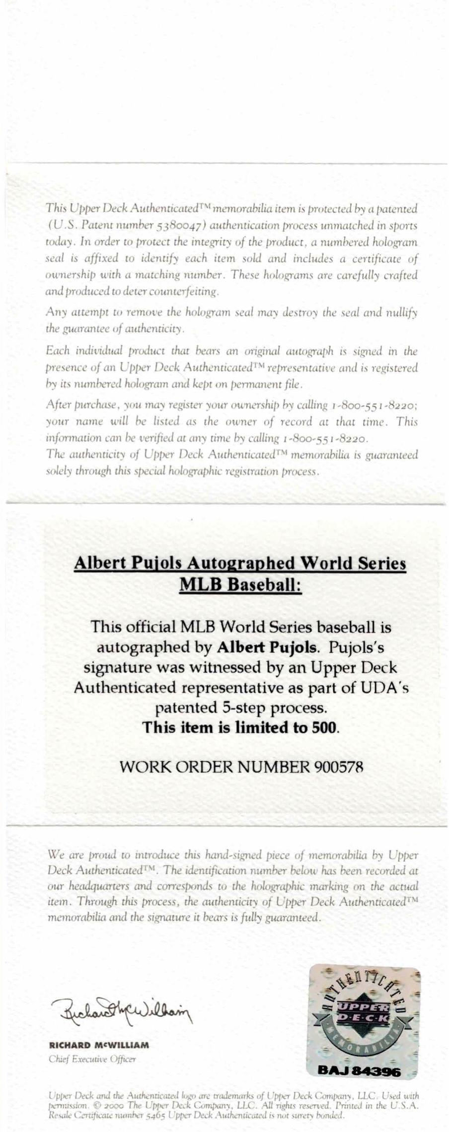Rawlings Official 2006 World Series baseball has been hand-signed by Albert Pujols (St. Louis Cardinals). This item is limited edition and has been hand-numbered #24/500.