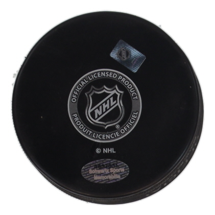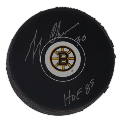 Boston Bruins logo hockey puck. Hand-signed and inscribed by Gerry Cheevers (HOF).