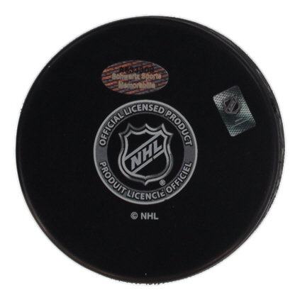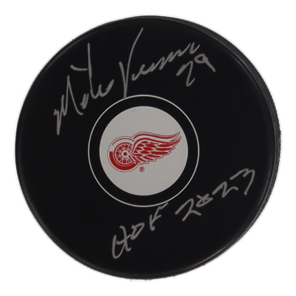Detroit Red Wings logo hockey puck has been hand-signed and inscribed by Mike Vernon (HOF).
