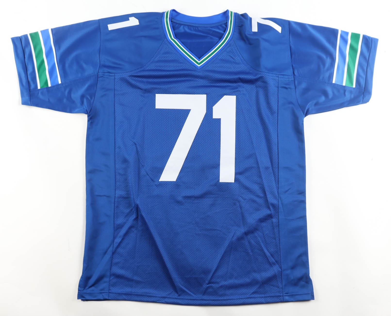 Custom jersey with everything sewn on, size XL. Hand-signed and inscribed by Walter Jones (HOF).