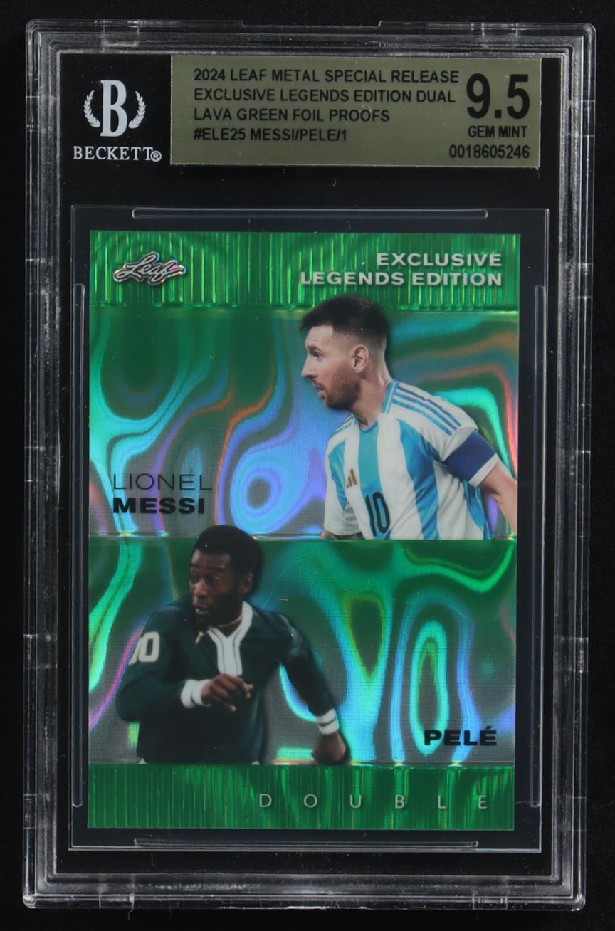 Lionel Messi / Pele 2024 Leaf Metal Special Release Exclusive Legends Ed. Dual Lava Green Foil Proofs #ELE25 (BGS 9.5)