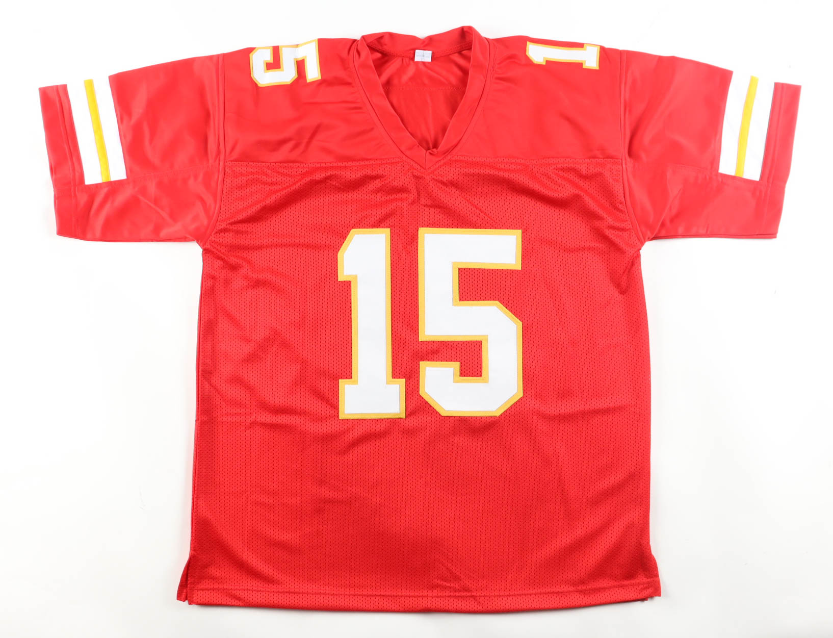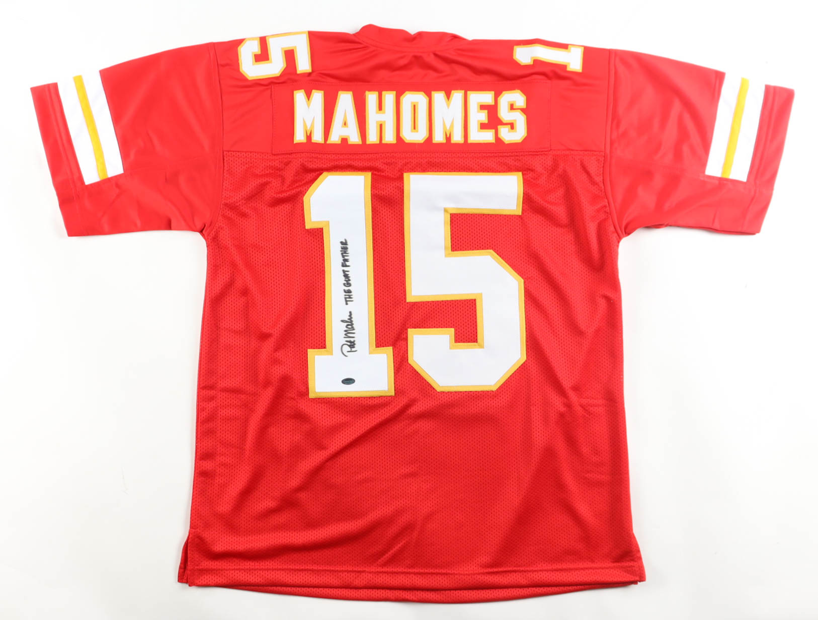 Custom jersey everything is sewn on, size XL. Hand-signed and inscribed by Patrick Mahomes Sr. Please note, there is a stain on the reverse number.