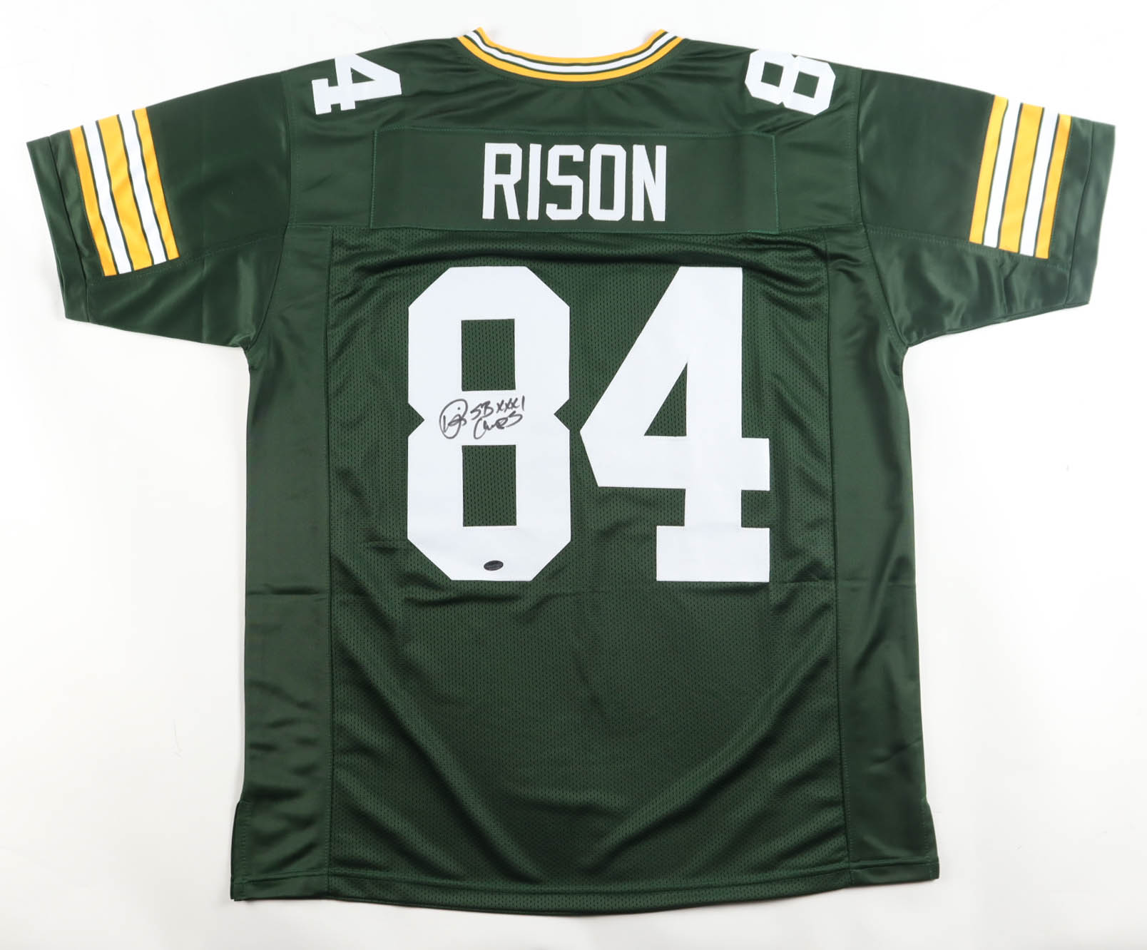 Custom jersey with everything sewn on, size XL. Hand-signed and inscribed by Andre Rison.