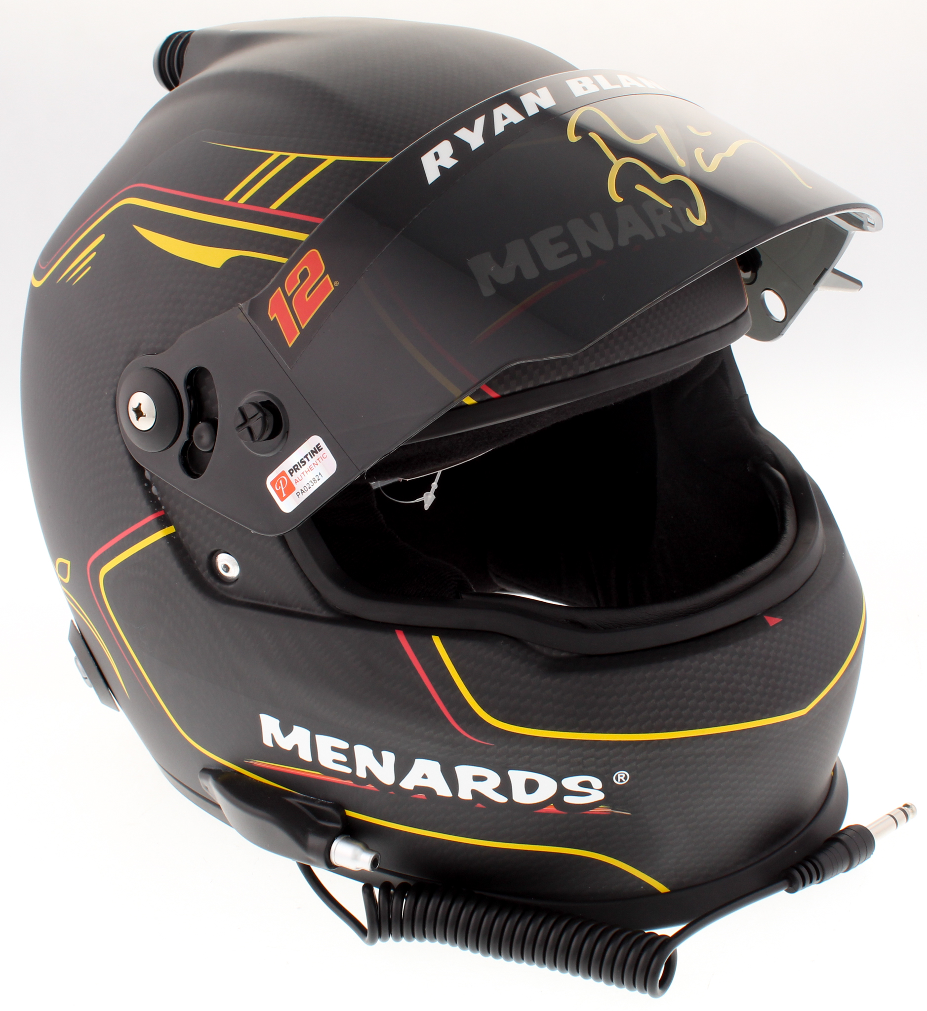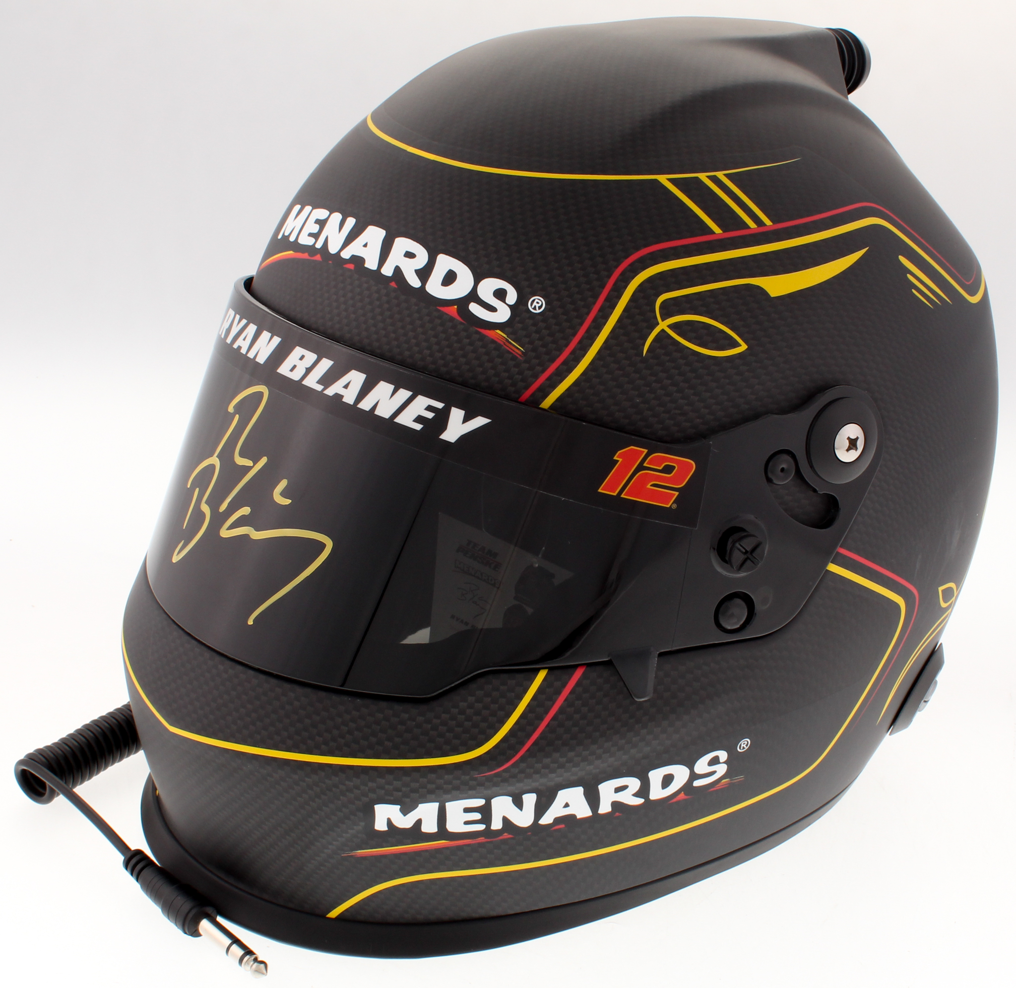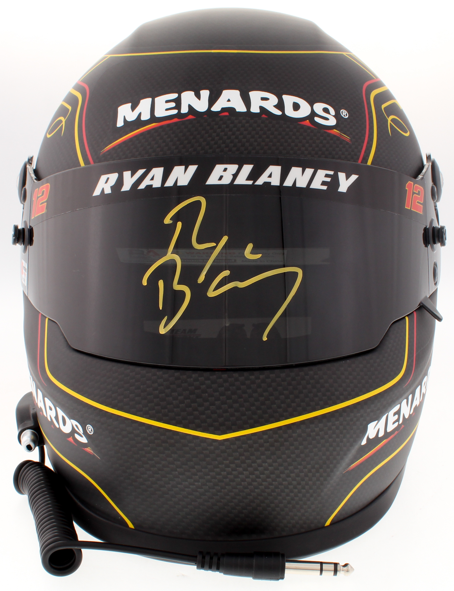 Full-size special edition replica NASCAR helmet has been hand-signed on the visor by Ryan Blaney.