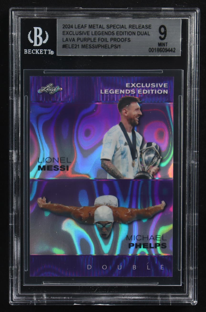 Lionel Messi / Michael Phelps 2024 Leaf Metal Special Release Exclusive Legends Ed. Dual Lava Purple Foil Proofs #ELE21 (BGS 9)