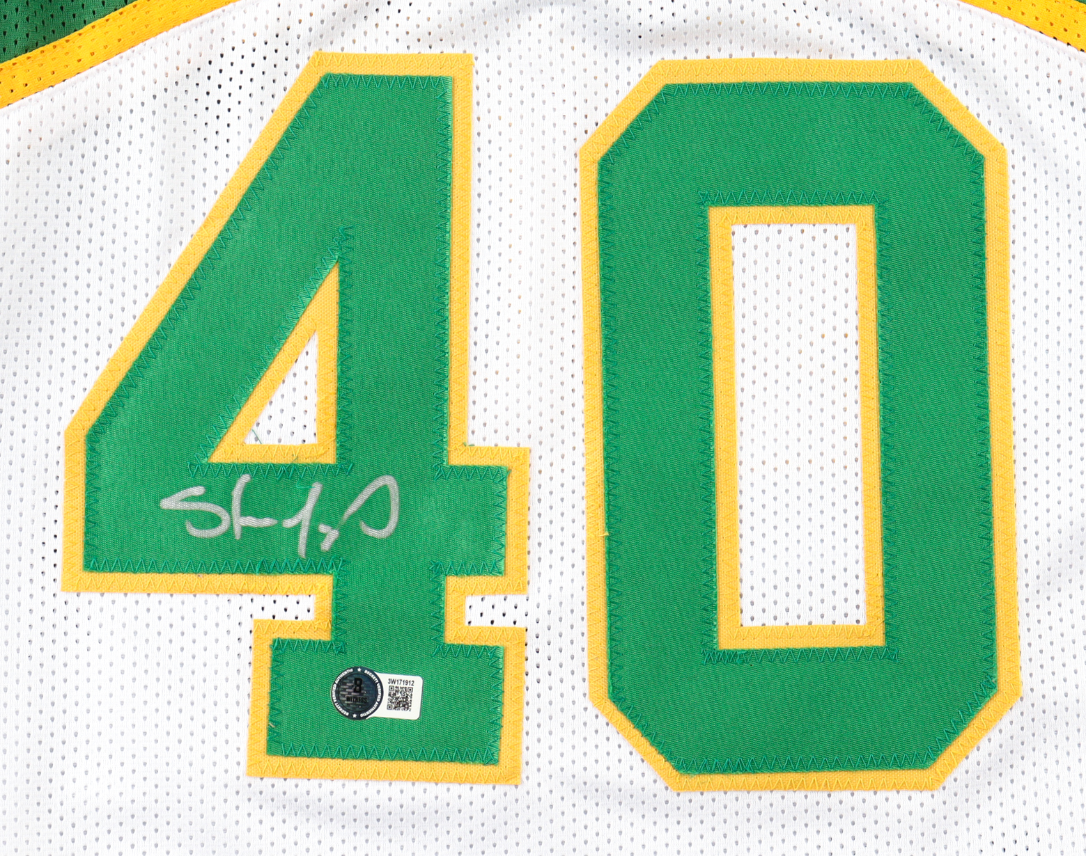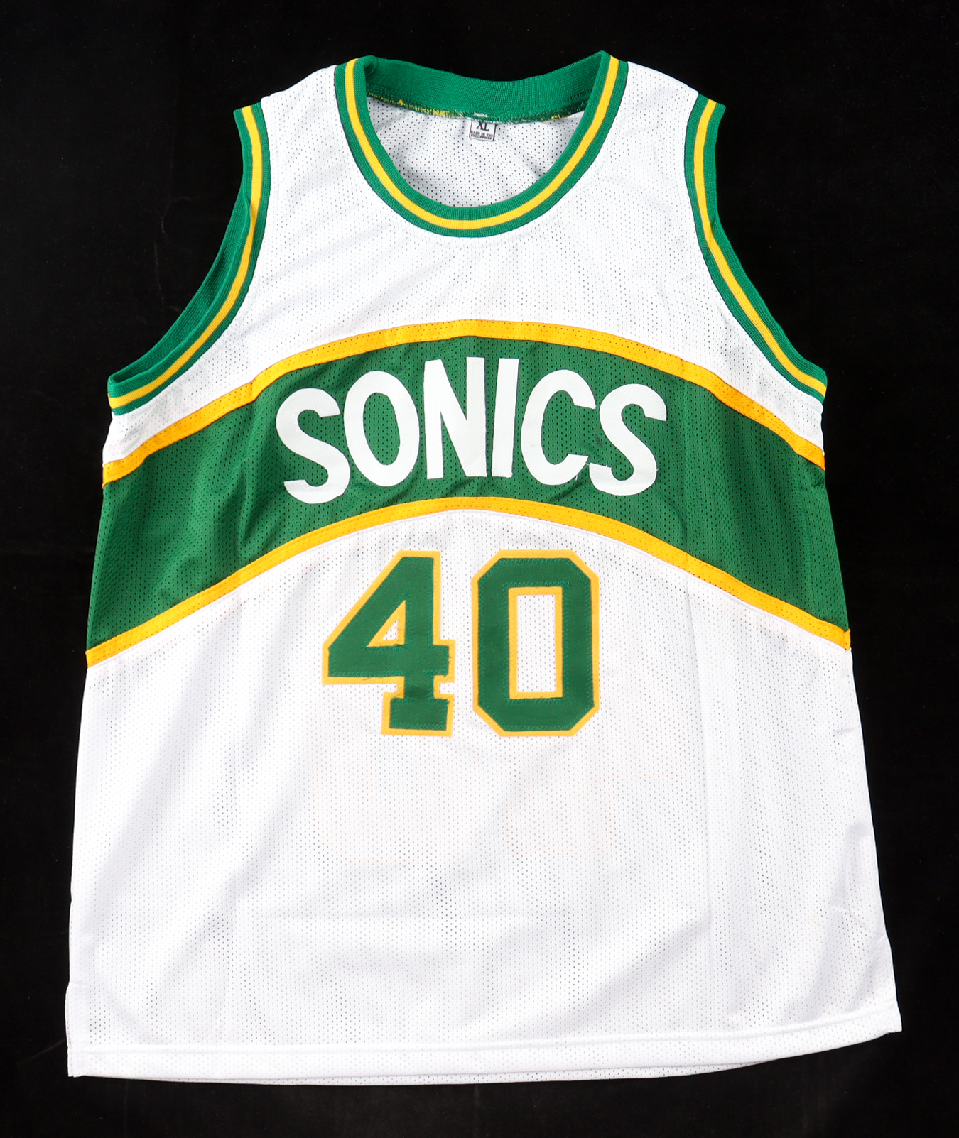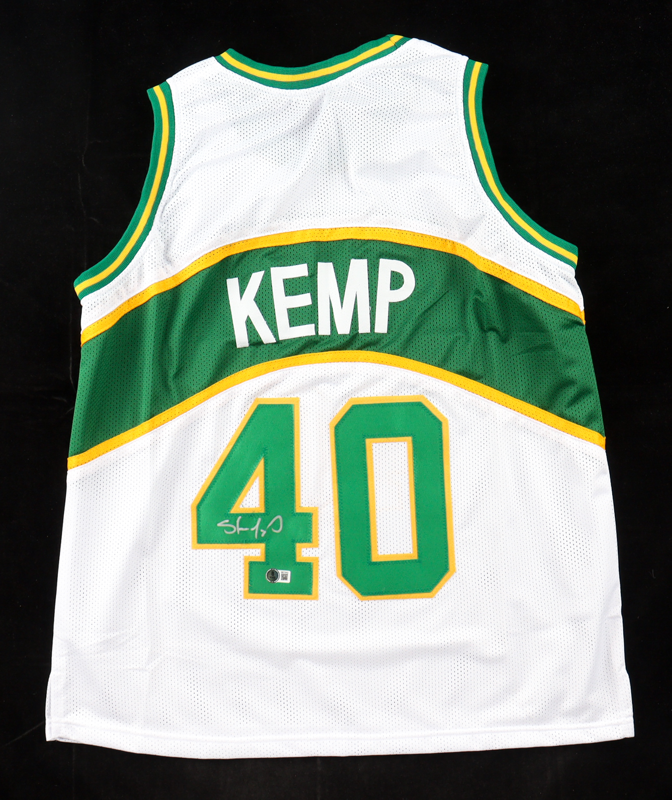 Custom jersey with everything sewn on, size XL. Hand-signed by Shawn Kemp.