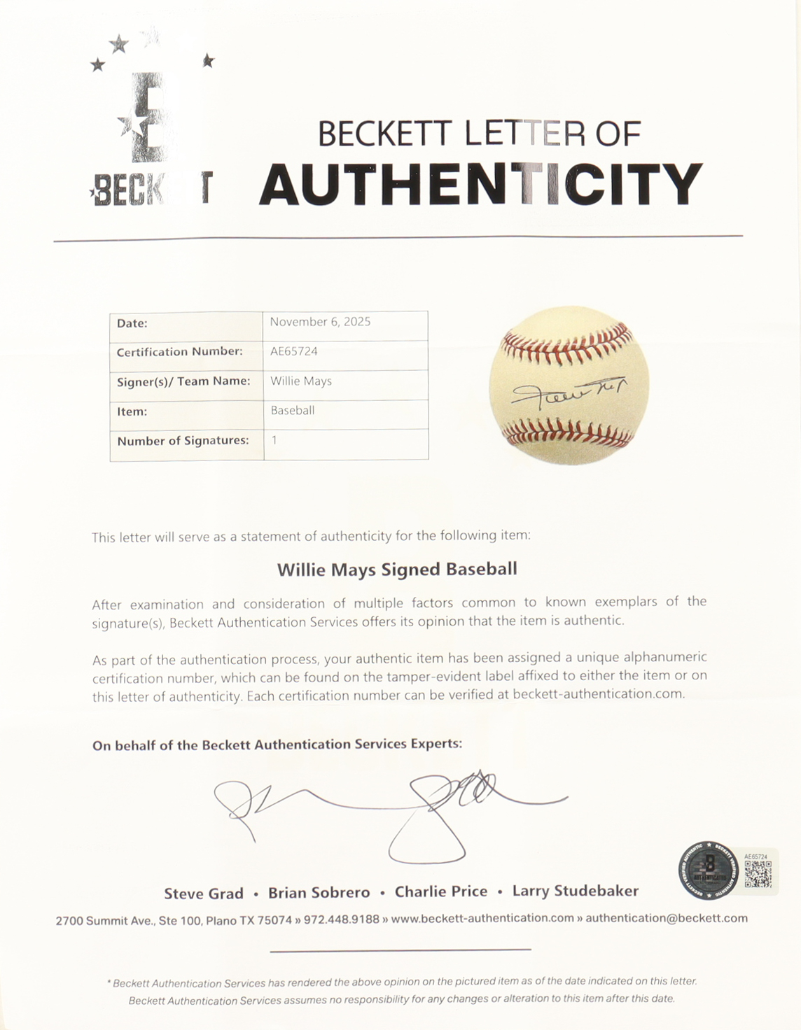 The autograph includes an official Beckett Authentication Services hologram and matching LOA for authenticity purposes.