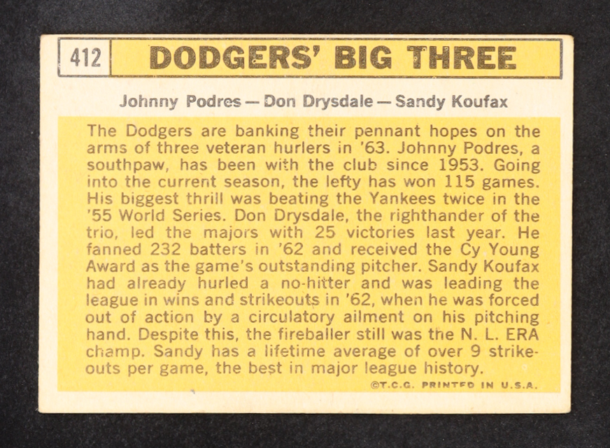 Johnny Podres / Don Drysdale / Sandy Koufax 1963 Topps #412 / Dodgers Big Three