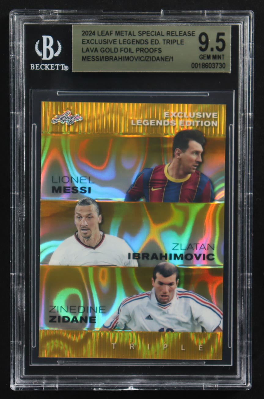 Lionel Messi / Zinedine Zidane / Zlatan Ibrahimovic 2024 Leaf Metal Special Release Exclusive Legends Ed. Triple Lava Gold Foil Proofs (BGS 9.5)