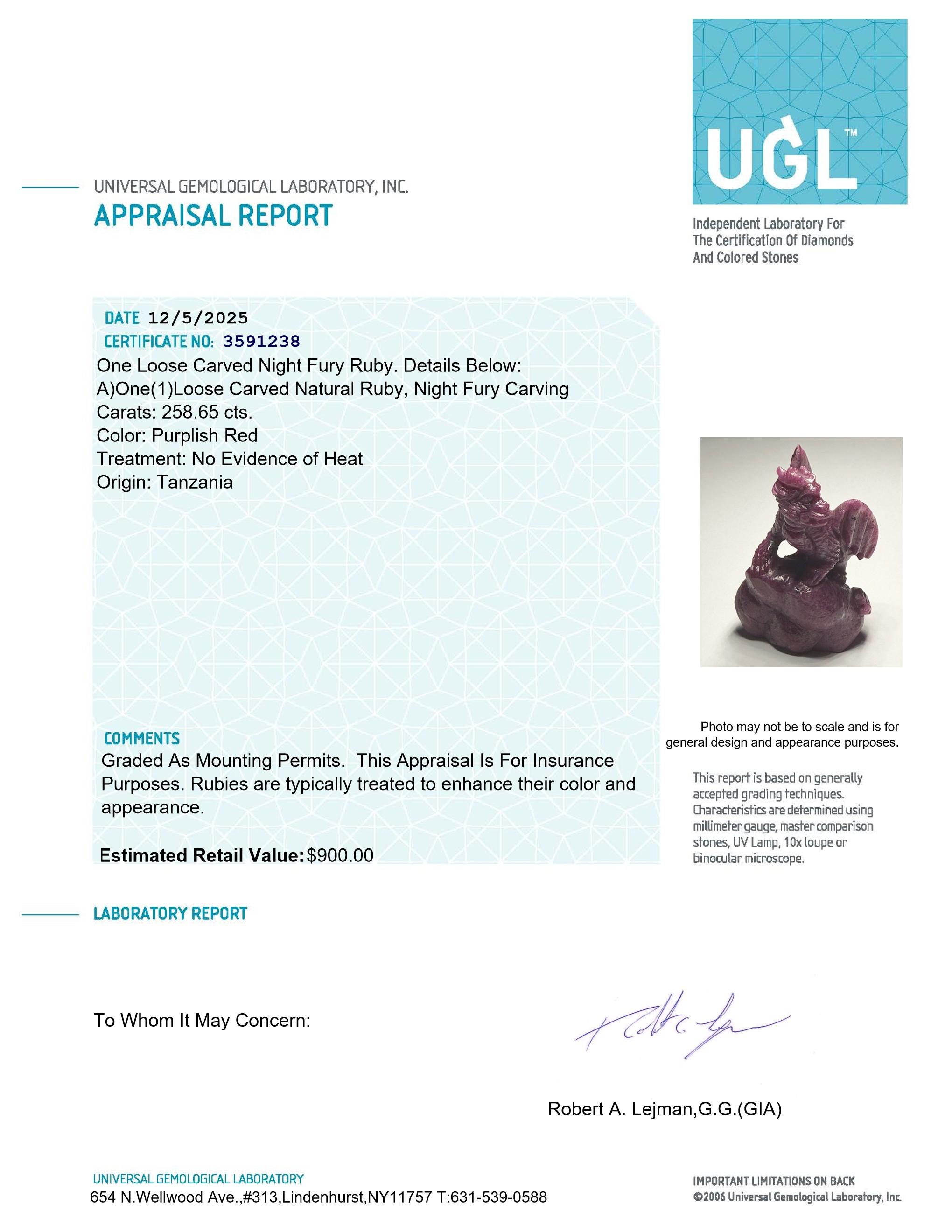 258.65 Carats Natural Ruby Night Fury Dragon Carving | Estimated Retail Value: $900 (UGL Cert)