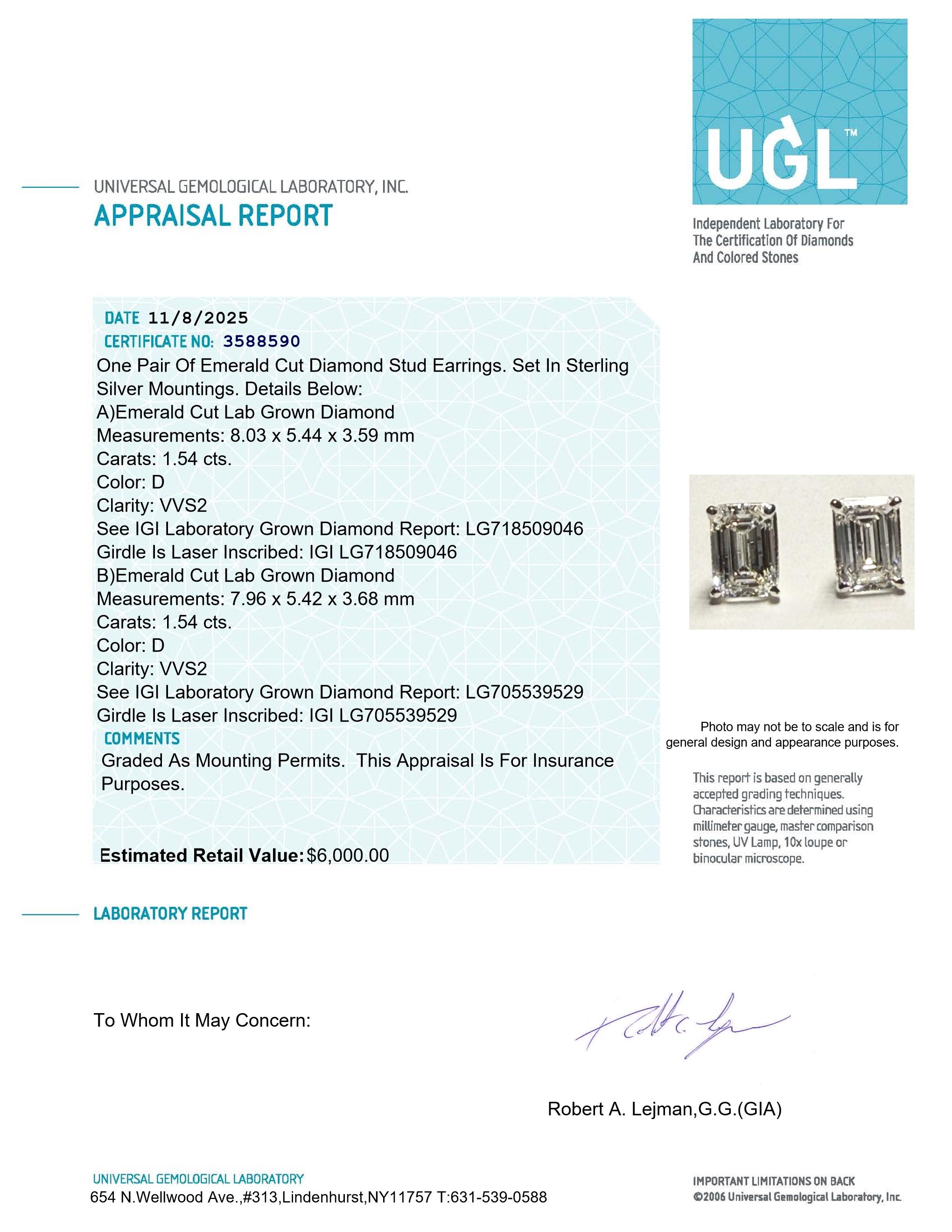 New 3.08 Carats Lab Grown Diamond Stud Earrings D, VVS2 | Estimated Retail Value: $6,000 (UGL & IGI Certs)