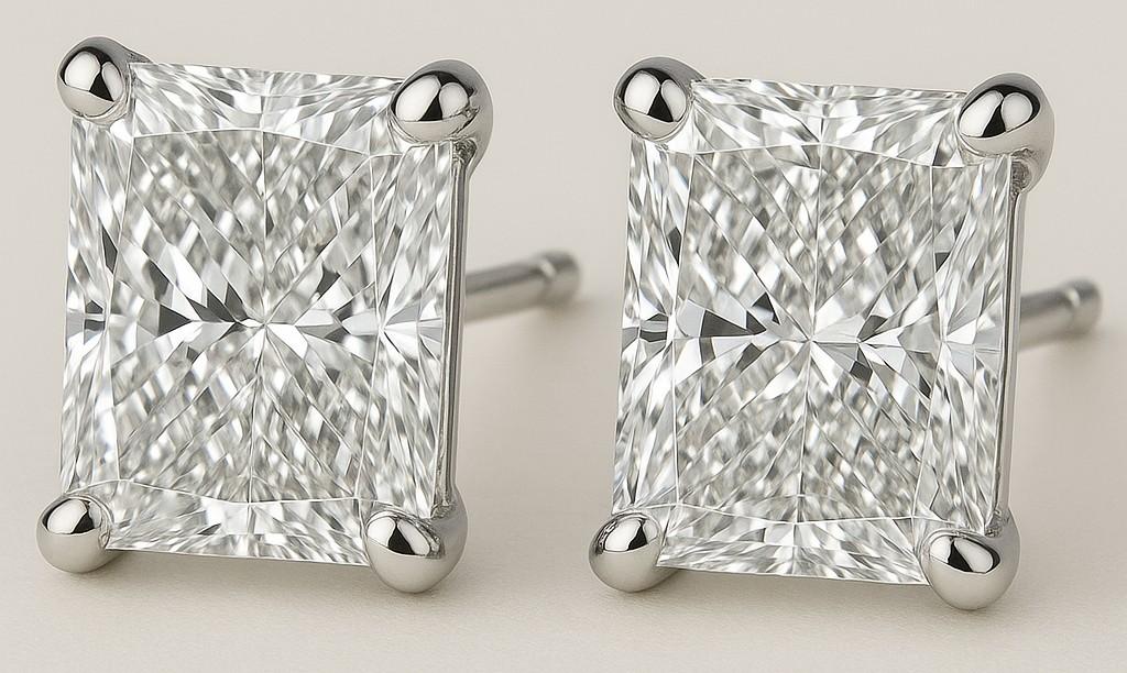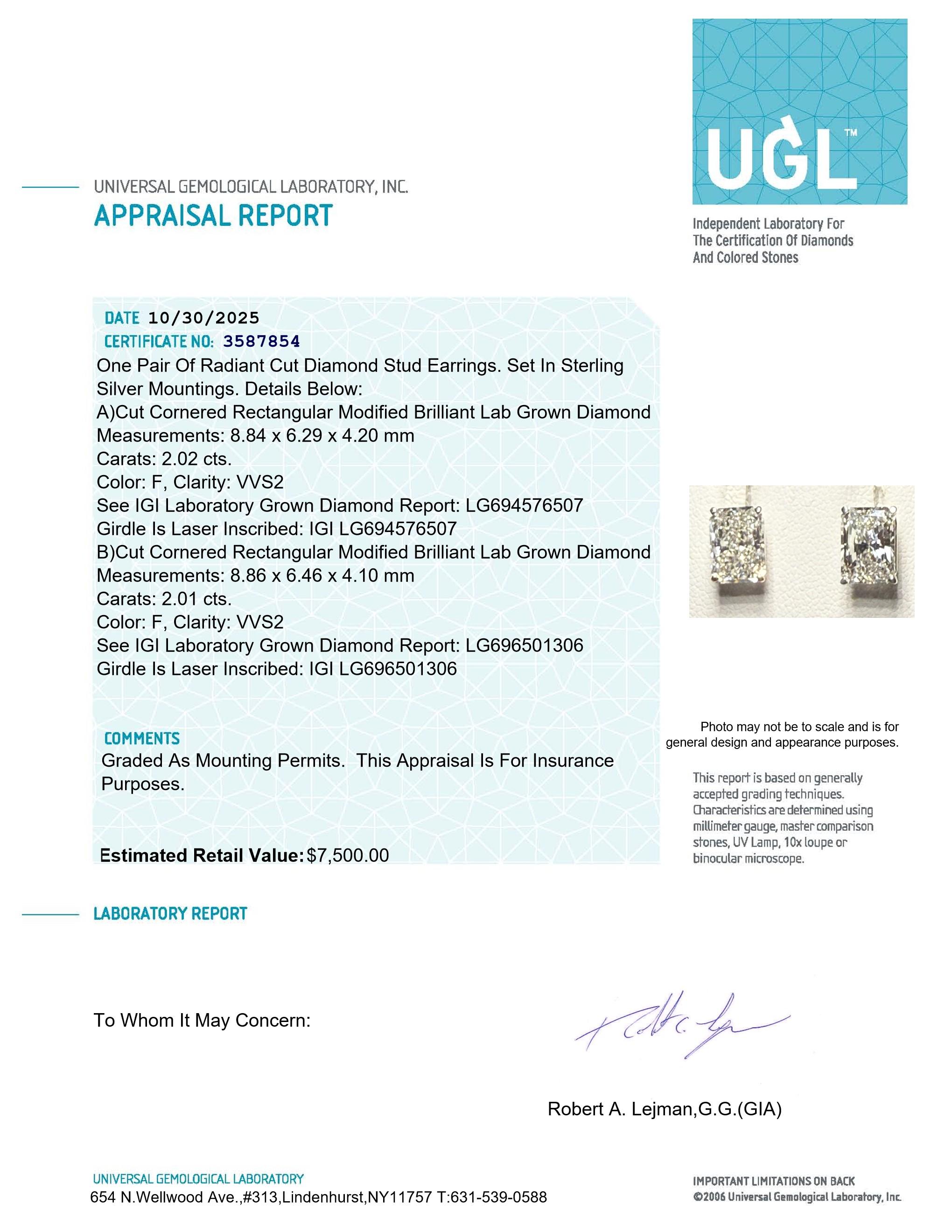 New 4.03 Carats Lab Grown Diamond Stud Earrings F, VVS2 | Radiant Cut | Estimated Retail Value: $7,500 (UGL & IGI Certs)