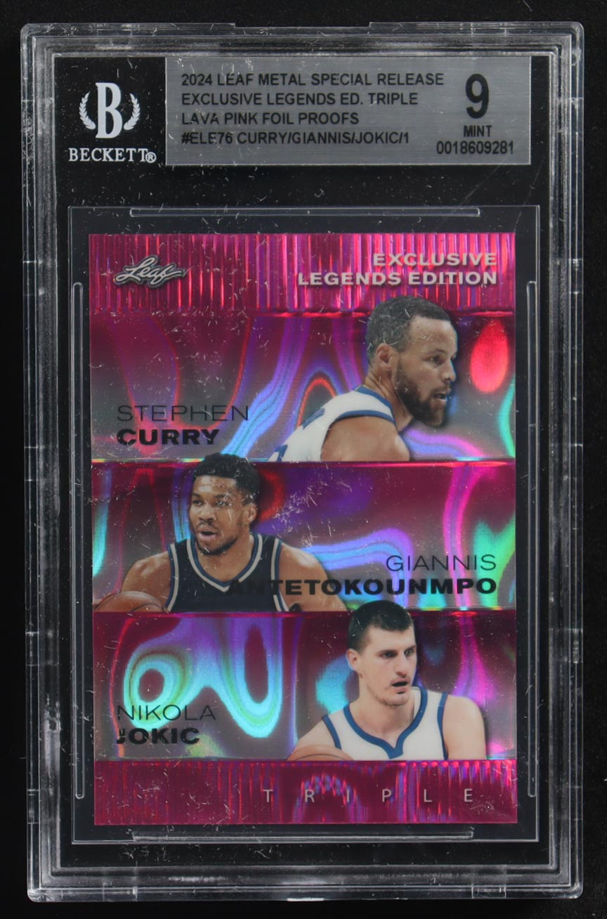 Nikola Jokic / Giannis Antetokounmpo / Stephen Curry 2024 Leaf Metal Special Release Exclusive Legends Ed. Triple Lava Pink Foil Proofs #ELE76 (BGS 9)