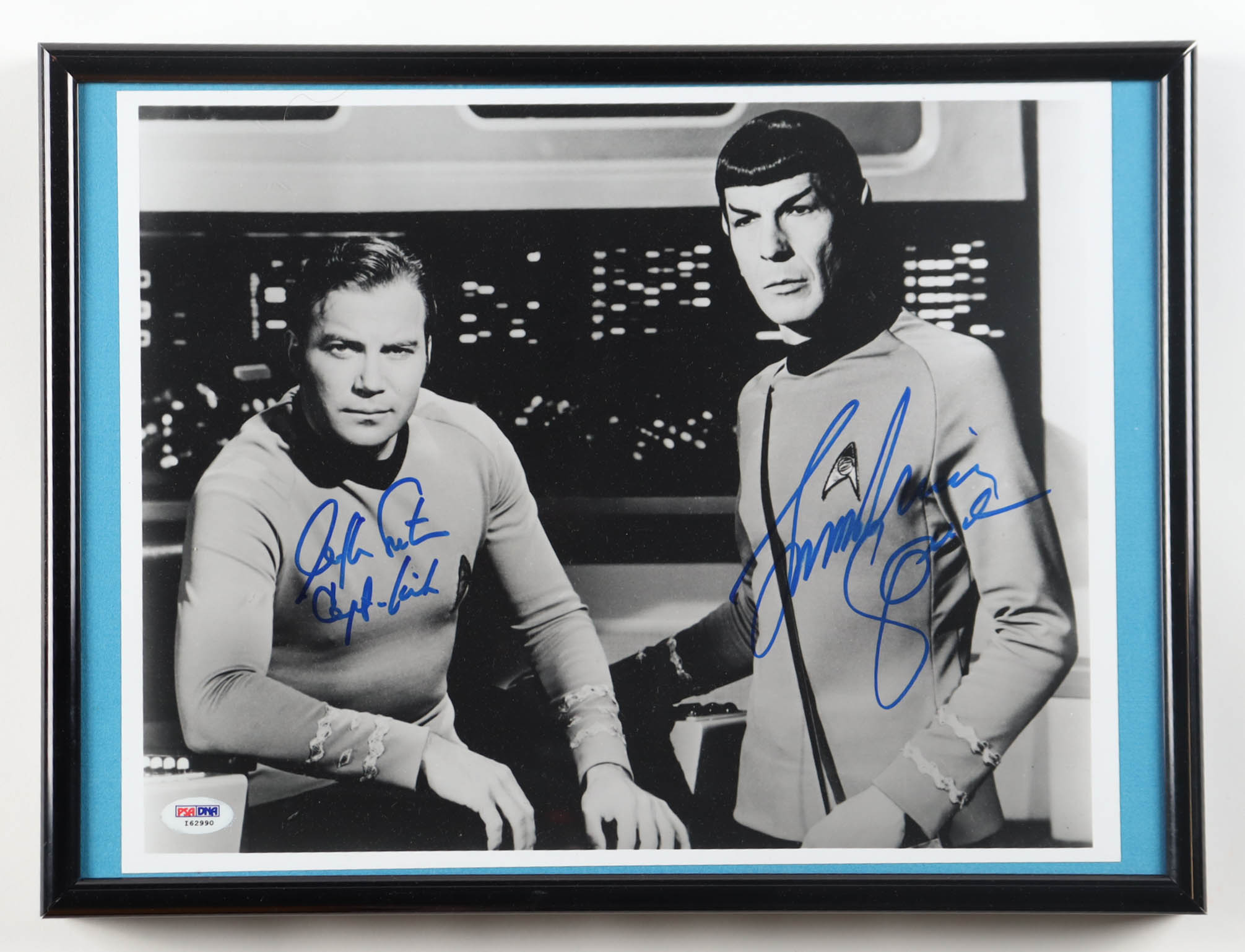 Custom frame measures 12" x 16" in size. Photograph is hand-signed by William Shatner and Leonard Nimoy (d. 2015).