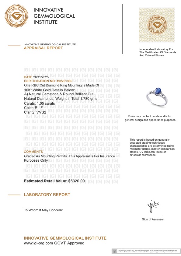 This piece includes paperwork from the Innovative Gemological Institute (IGI).
