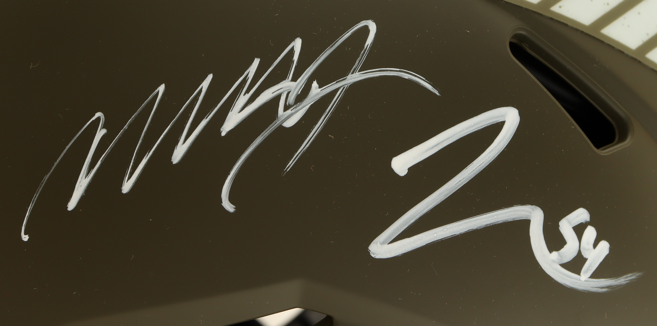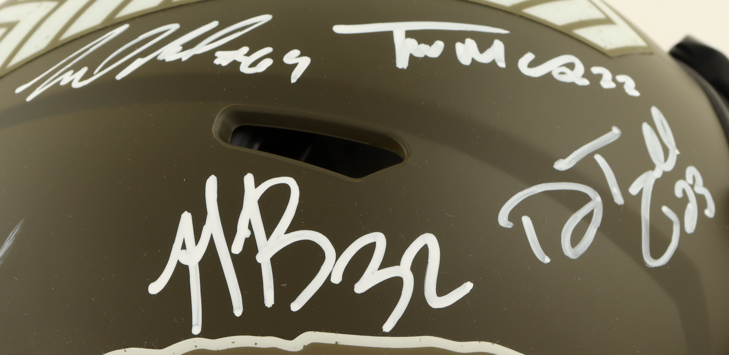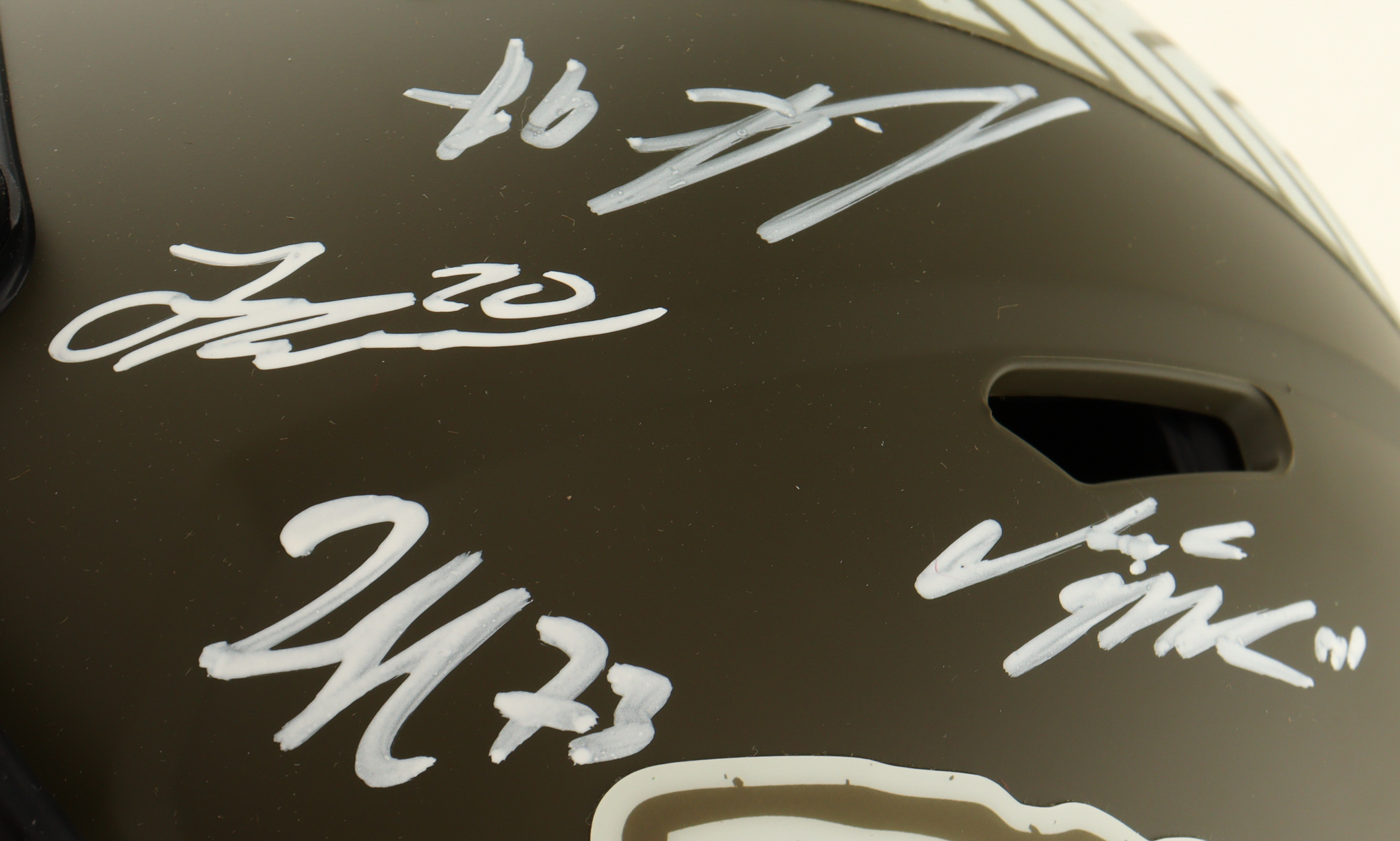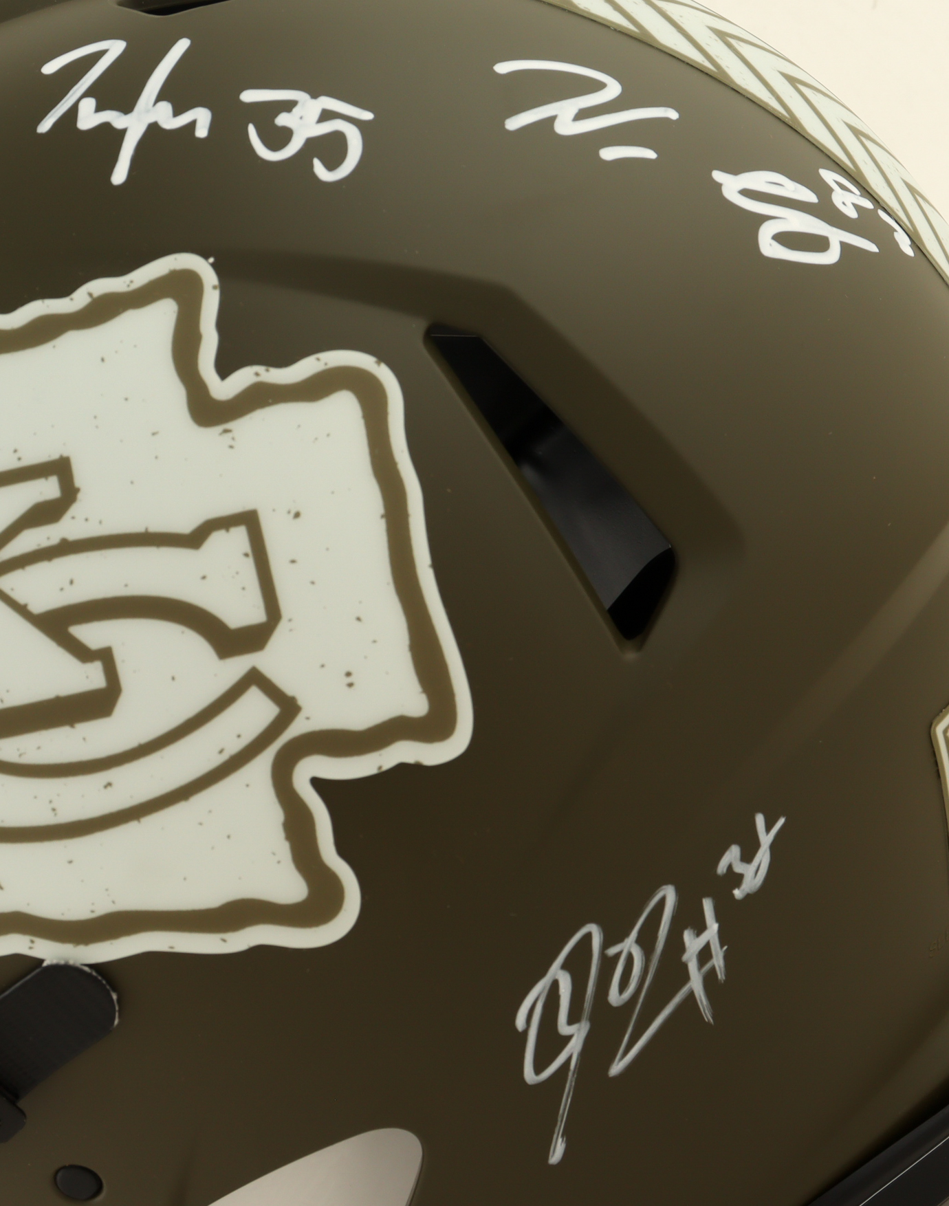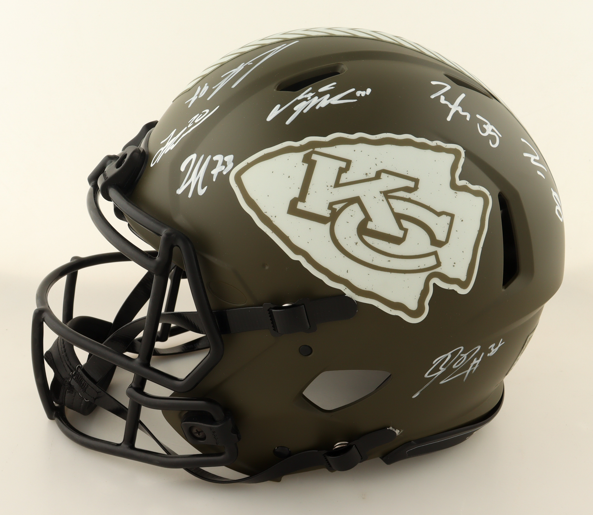 Riddell Kansas City Chiefs Full-Size Authentic On-Field Salute to Service Alternate Speed Helmet. Hand-signed by L'Jarius Sneed, Willie Lanier, Drue Tranquill, Leo Chenal, Nick Bolton, Nick Allegretti, Justin Reid, Felix Anudike-Uzomah, Trent McDuffy, Jaylen Watson, Jerick McKinnon, Mike Pennel, George Karlaftis, Noah Gray, and Mecole Hardman.