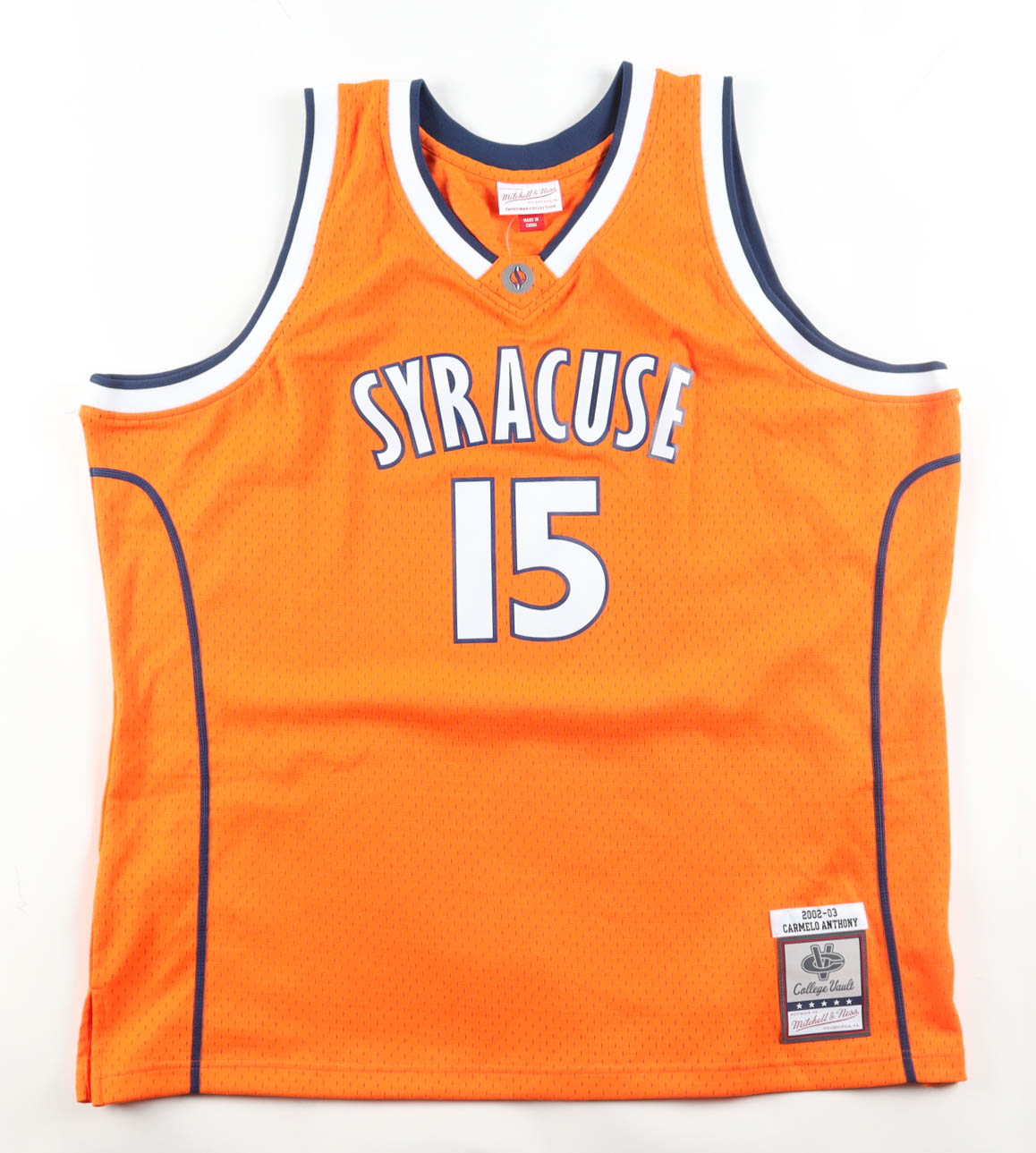 Mitchell & Ness authentic jersey with everything pressed on, size 2XL. Hand-signed and inscribed by Carmelo Anthony (Syracuse Orange, HOF).