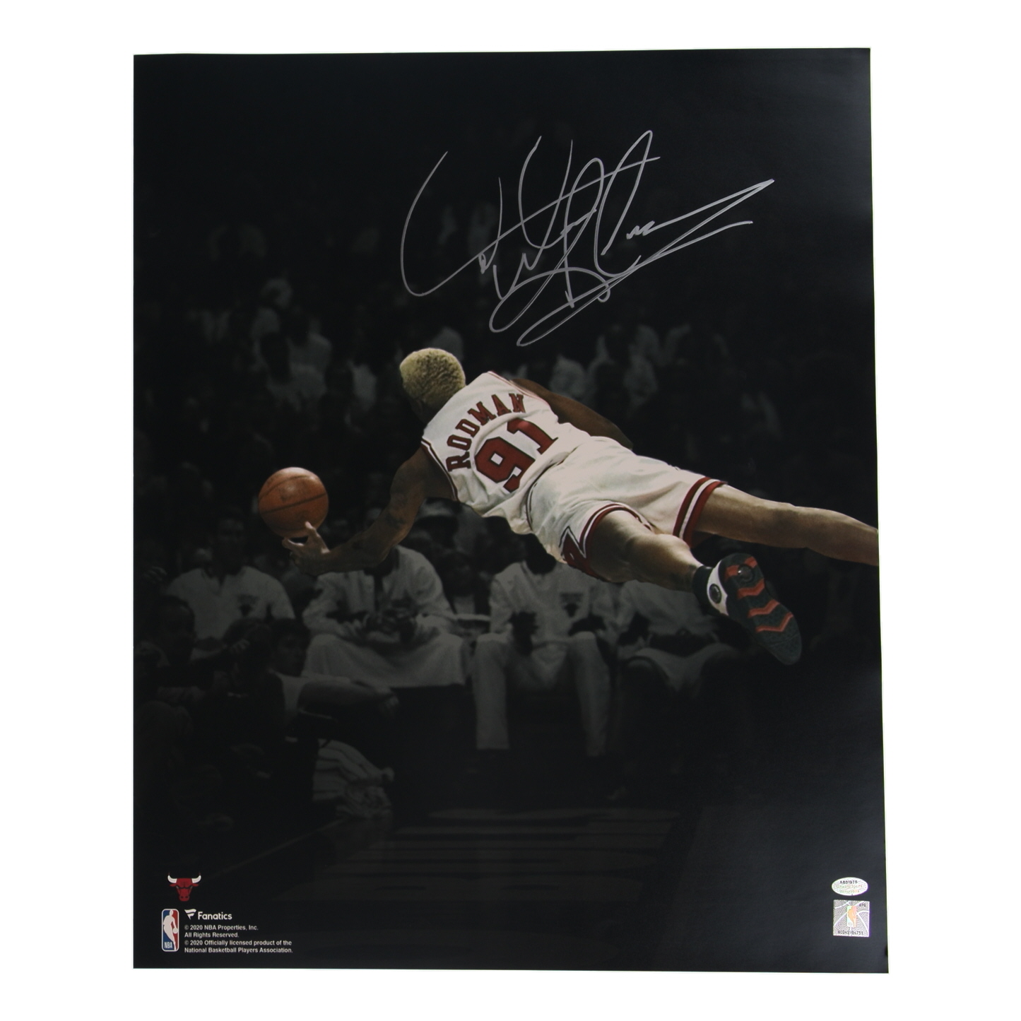 Photo measures 16" x 20" in size and has been hand-signed by Dennis Rodman (Chicago Bulls, HOF).
