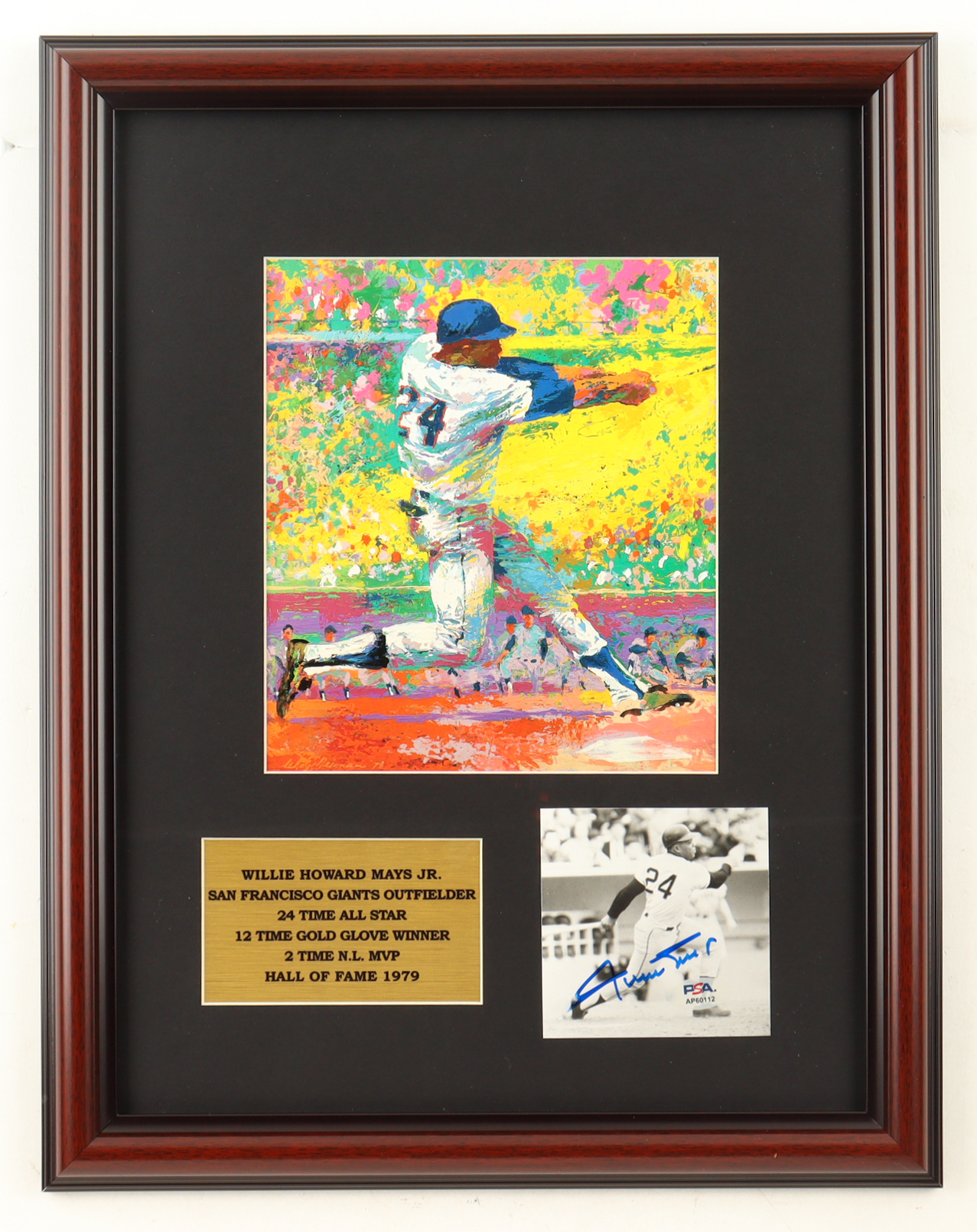 Willie Mays Signed Custom Framed Photo Display with Leroy Neiman Art Print & Career Statistics Plaque (PSA)