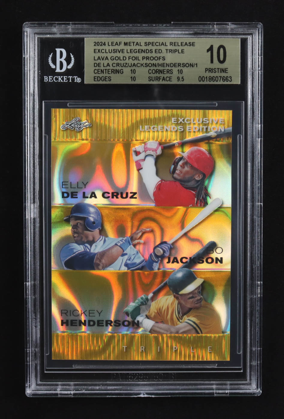 Elly De La Cruz / Bo Jackson / Rickey Henderson 2024 Leaf Metal Special Release Exclusive Legends Ed. Triple Lava Gold Foil Proofs #1/1 (BGS 10)