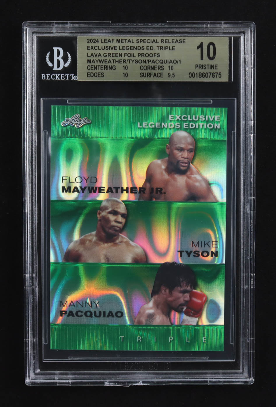 Mike Tyson / Floyd Mayweather Jr. / Manny Pacquiao 2024 Leaf Metal Special Release Exclusive Legends Ed. Triple Lava Green Foil Proofs (BGS 10)