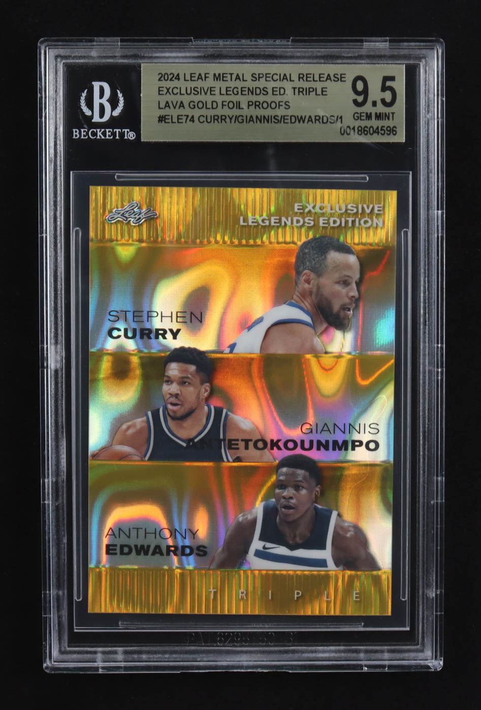 Giannis Antekounmpo / Anthony Edwards / Stephen Curry 2024 Leaf Metal Special Release Exclusive Legends Ed. Triple Lava Gold Foil Proofs #ELE74 (BGS 9.5)
