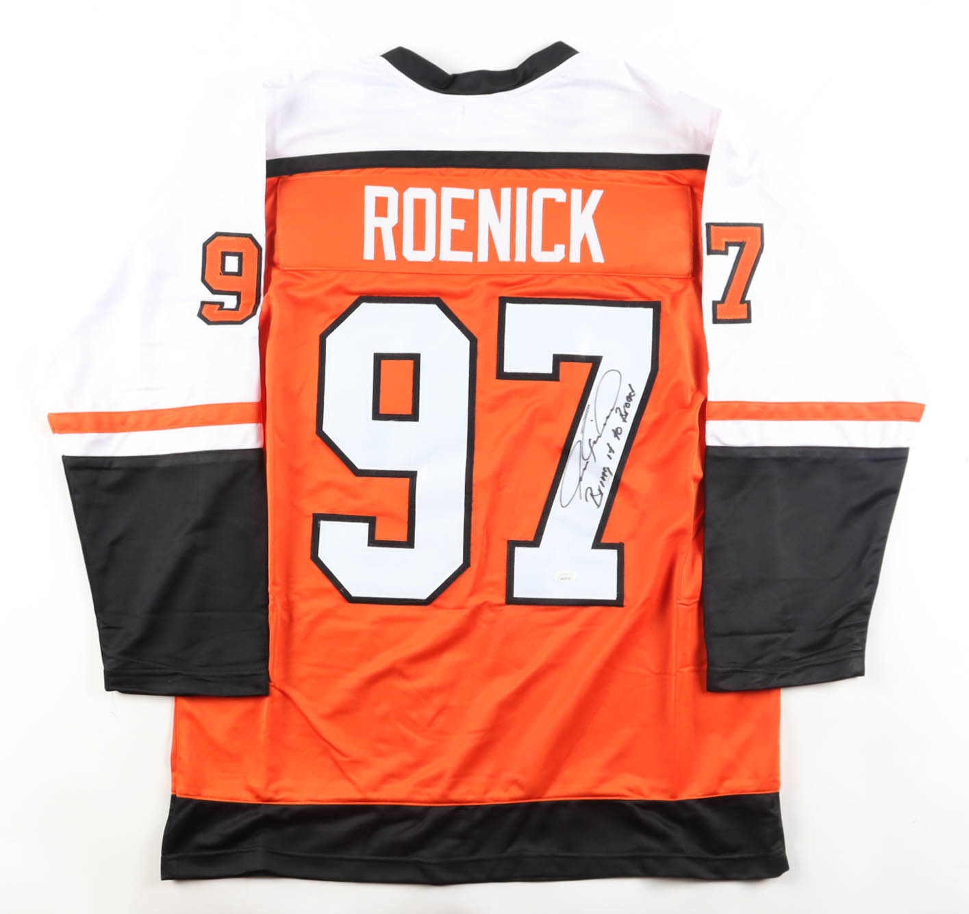 Custom jersey with everything sewn on, size XL. Hand-signed and inscribed by Jeremy Roenick (HOF).